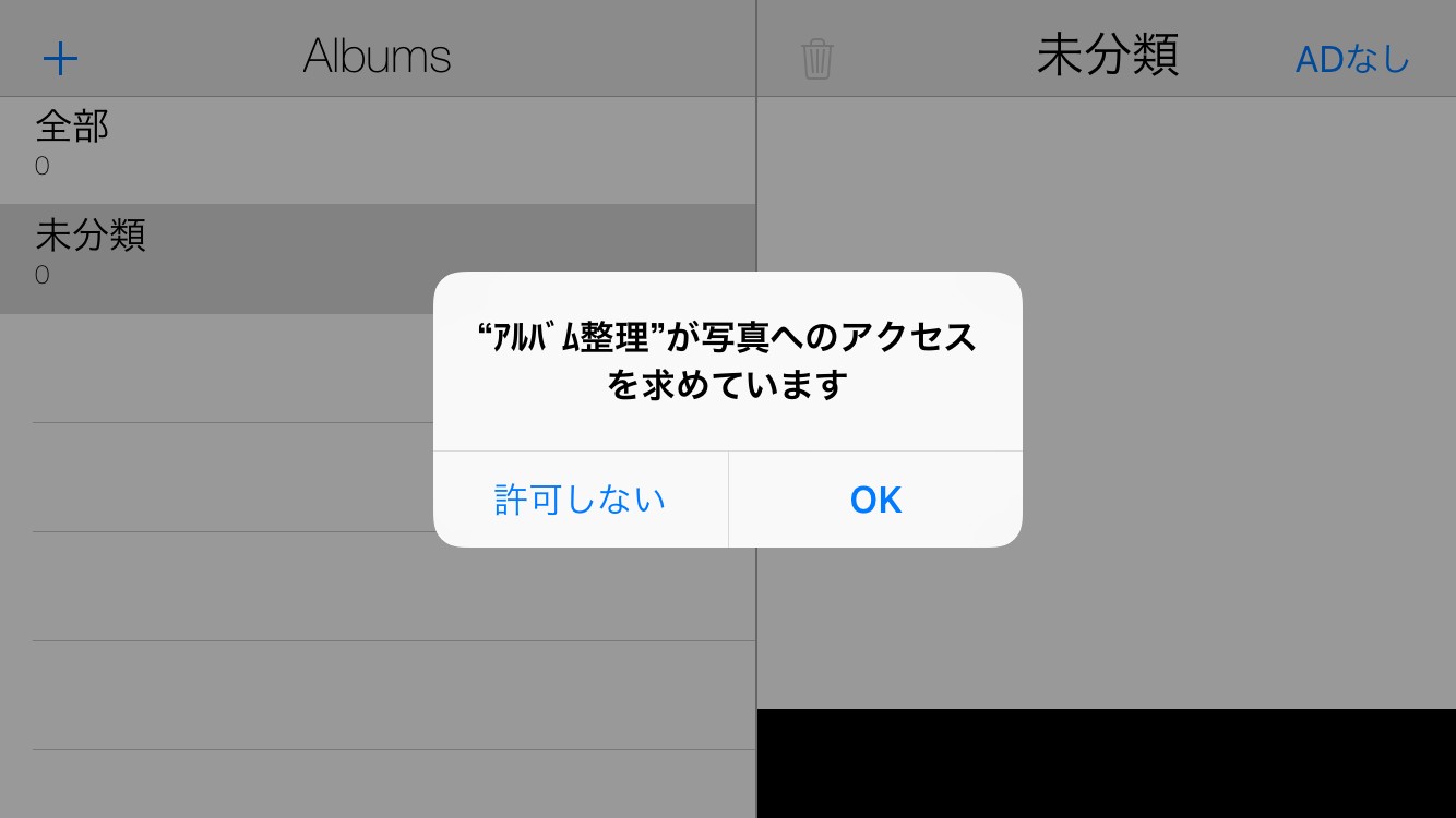 「超簡単!アルバム整理」を実際に使ってみると、簡単に写真の整理が出来ました。アプリをインストールすると、写真へのアクセスしてもいいかの確認があるのでOKにしましょう。すると、右半分のUncategorizedに写真が並んで出てきます。分類されてないUncategorized写真を長押し、左側のAlbumsにドラッグ&ドロップすれば入れたいアルバムに分類できます。削除したい写真は、右上のゴミ箱ボタンで削除しましょう。確認画面が出るので安心ですよ。新規アルバム作成は左上+ボタンでアルバムを作ることができ、アルバム名の入力が可能です。削除したいアルバムはスワイプするとDeleteできるようになっています。「超簡単!アルバム整理」はスマホを横にして使うようになってるので、多くの写真が一度に確認でき、ドラッグ&ドロップしやすいです。