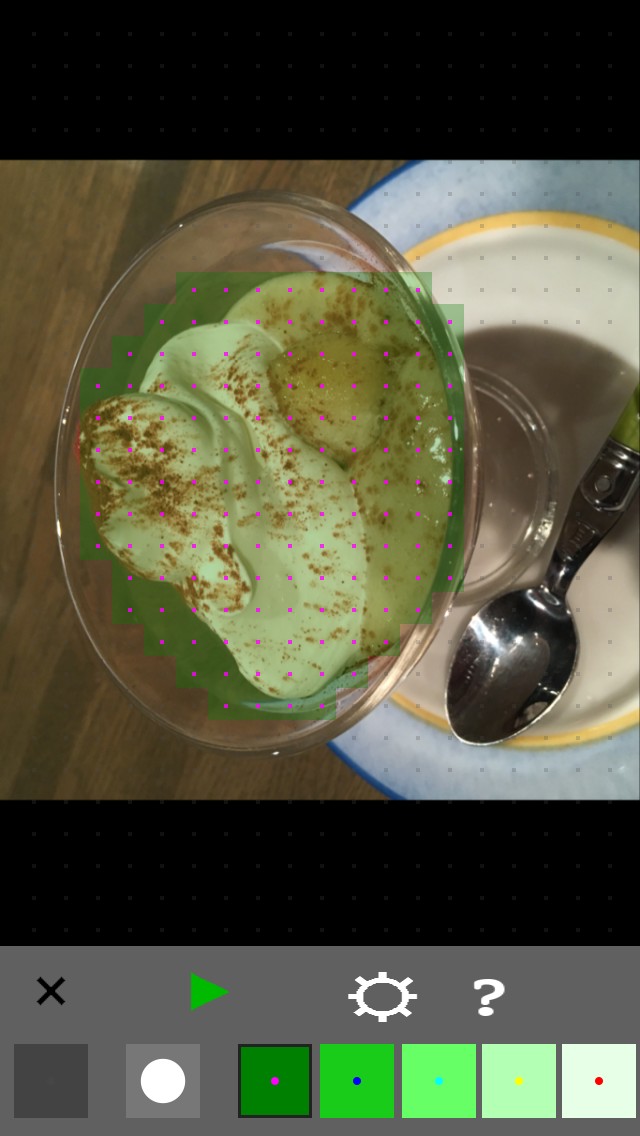 写真を選択すると、ゆらしたい箇所を設定する画面に切り替わります。画面下部右側の緑色のボタンをタップし、写真上のゆらしたい箇所を塗りましょう。濃い緑になるほど固いゆれになり、薄い黄緑になるほど柔らかいゆれの設定になります。ペンサイズを変更したい場合は、画面下部の白いボタンをタップしましょう。設定箇所を解除する場合は、画面下部の灰色のボタンをタップします。
