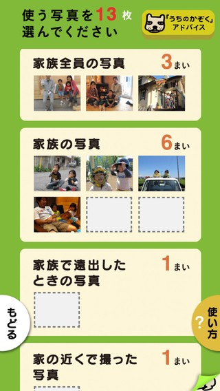 3.使う写真を13枚選ぶ。「家族全員の写真」を3枚、「家族の写真」を6枚、「家族で遠出した時の写真」を1枚、「家の近くで撮った写真」を1枚、「お父さんお母さんが出会った頃のツーショット写真」を2枚選ぶ。オプションで日付と作成者の名前も書き込めます。