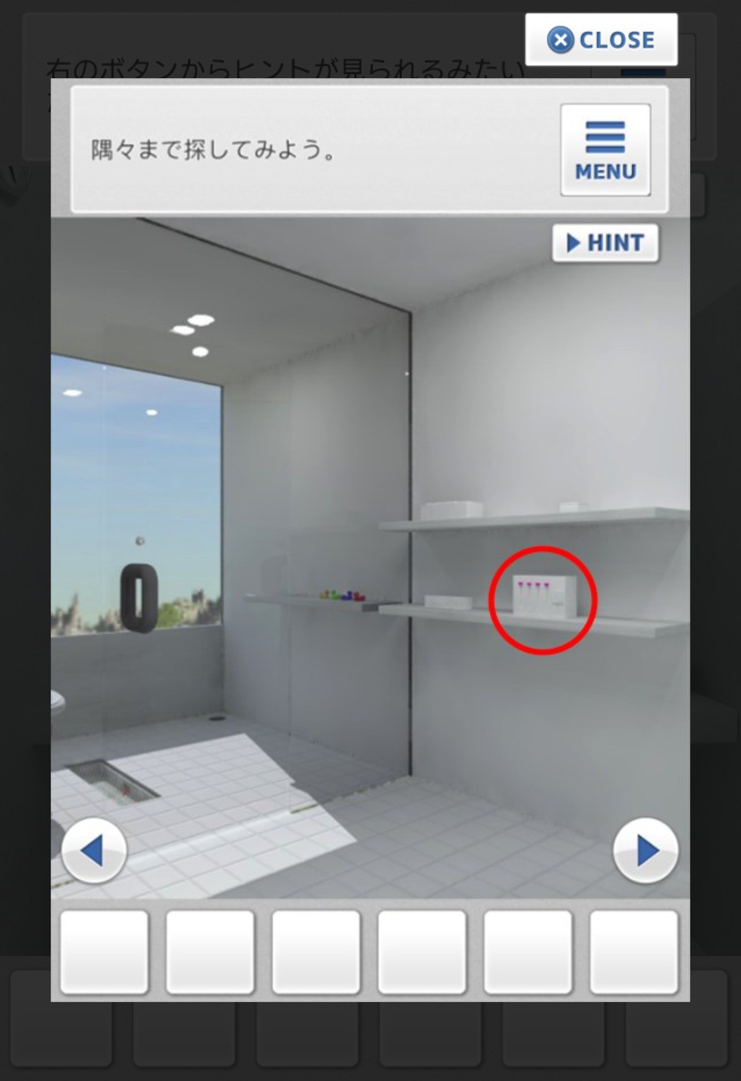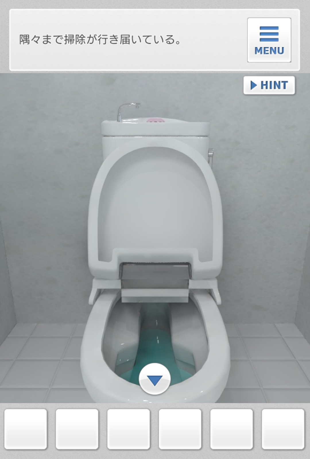 まずは、脱出に必要なアイテムを手に入れるために気になるところをタップで拡大、調査していきましょう。トイレットペーパーの芯や、トイレの水が流れる場所など、思いも寄らないところにヒントが散りばめられています。