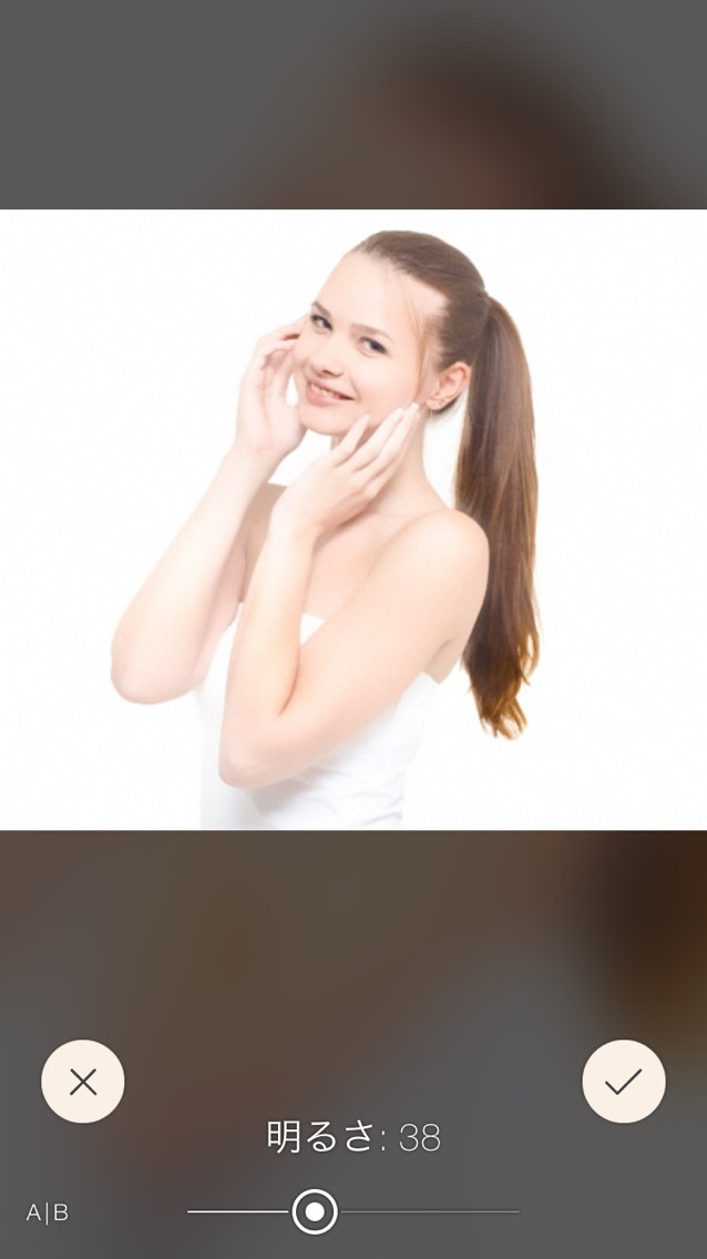 このようにほとんどの操作をワンタップで行うことができます。また、画面左下の「A|B」をタップすれば、加工前と加工後の写真を切替表示することができ、違いを簡単に確認することが可能です。