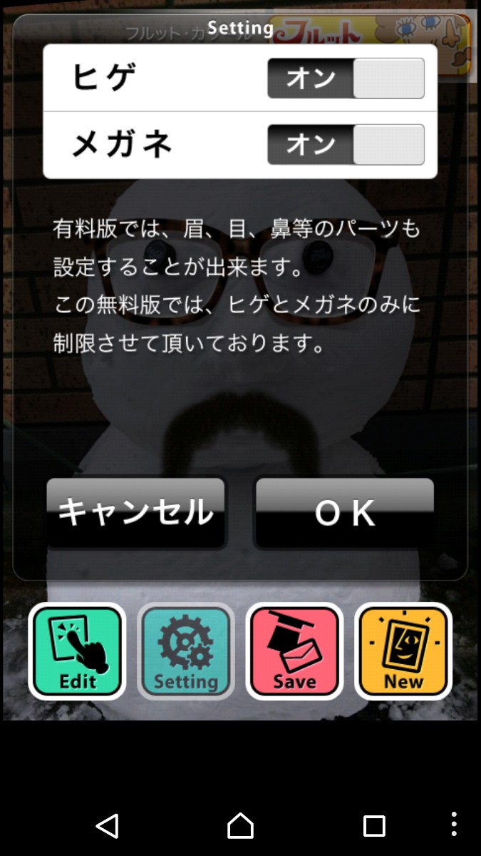 「フルット・カワール FREE」ではスマホをシェイクするだけで簡単に、「メガネ」と「ヒゲ」のパーツが用意してあります。それぞれのパーツを「オン・オフ」できるので、必要ない場合などは設定をオフにしてみてください。スマホでシェイクして偶然女の子にヒゲが生えてしまう、そんな惨事も未然に防ぐことができます。おもしろい写真に仕上げたい人はヒゲをオンにしてみてもいいかもしれません。有料版では「メガネ」、「ヒゲ」に加えて、「目」、「眉」、「メイク」、「鼻」の6種類のパーツが用意してあります。