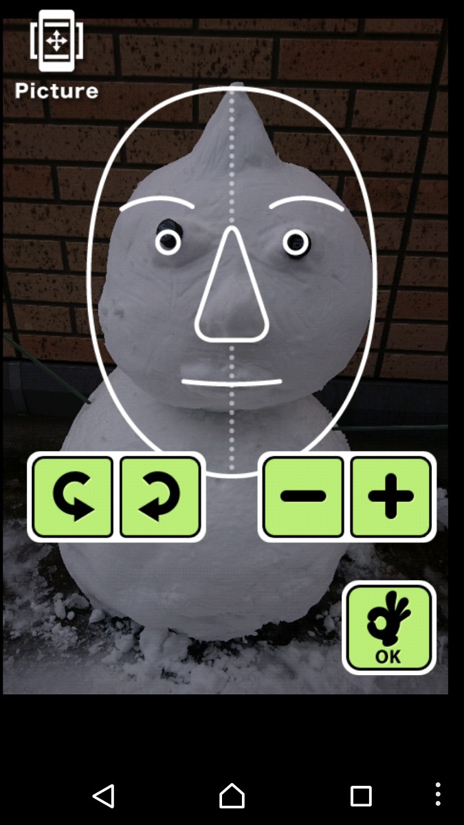 ・顔パーツの調整画面が表示されるので、写真の位置や大きさ、向きなどを手動で調整する。調整が完了したら「OK」を選ぶ。