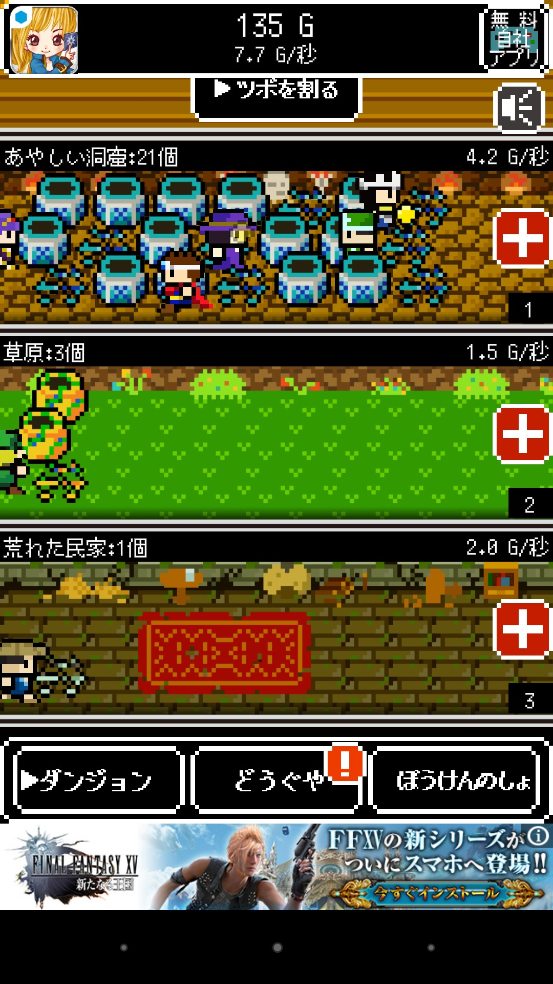 ダンジョンやフィールドもまた貯まったお金で画面右にある「+」マークをタップすることで開放されていきます。