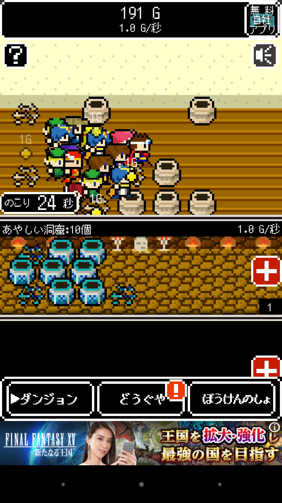 ダンジョンのツボ割りをしてくれる勇者が増えてくれば、お金も勝手にどんどん貯まっていってくれるので、プレイヤーはタップしなくてもよくなってきます。