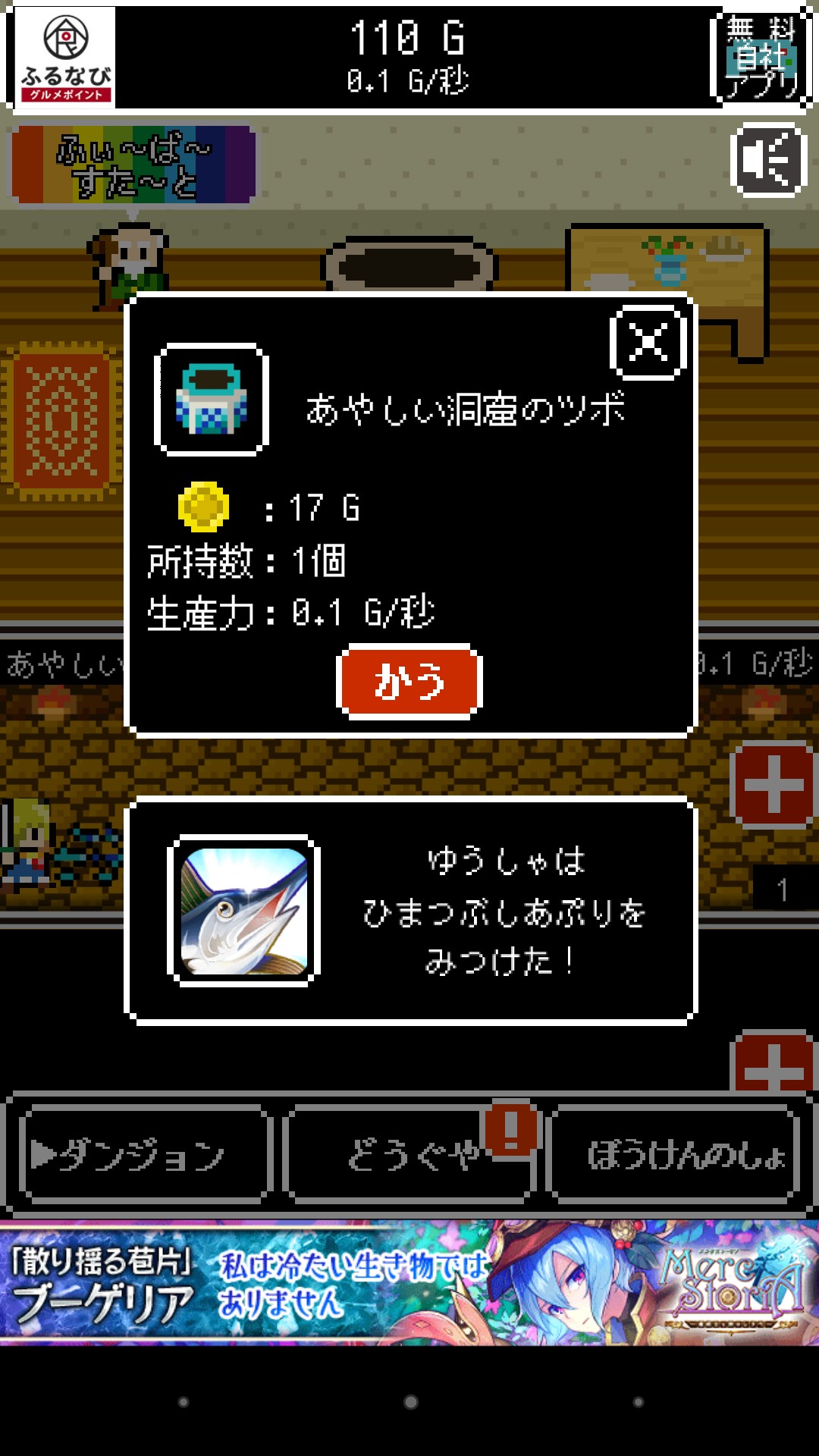 また、貯まったお金を消費して「どうぐや」で新しい種類のツボやダンジョンでのツボ割りに有利なアイテムを買うことも出来ます。