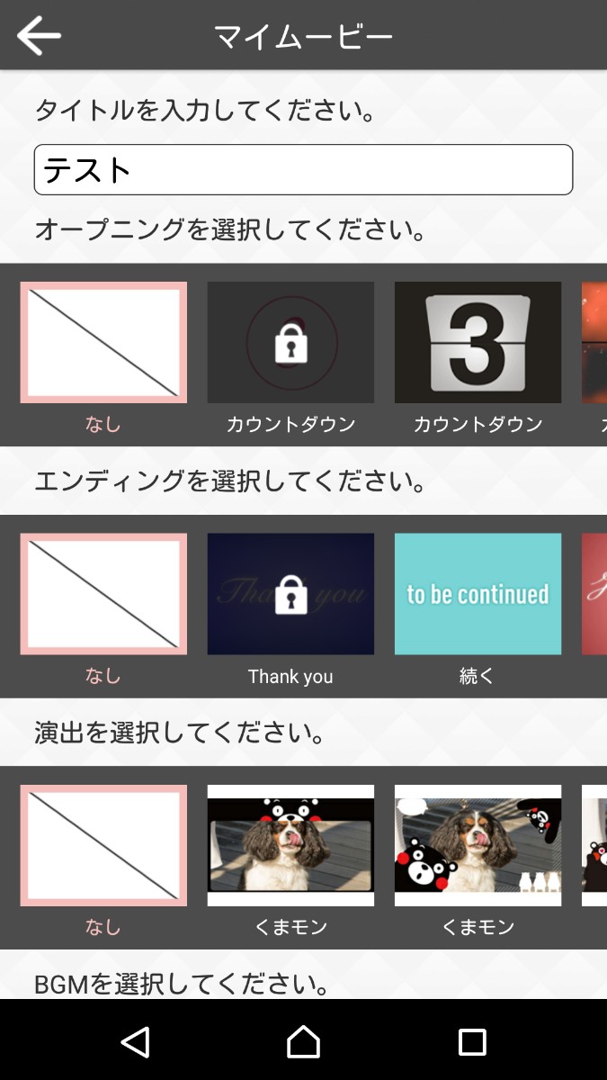 「オープニング」、「エンディング」、「演出」、「BGM」、「スクロール」、「シーン」、「動画の背景色」(縦向きの写真のみ)、「テキスト」など、細かく設定することができ、こだわりたい方などにもおすすめです。