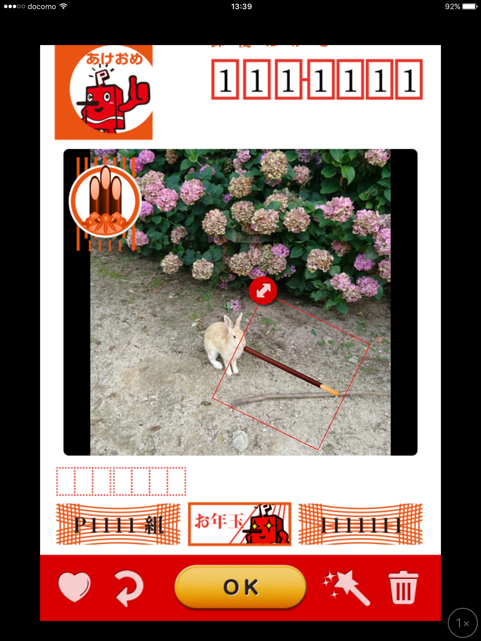 実際に加工しながら、「ポッキーシェアカメラ」の使い方を説明します。24フレームの中から好きなものを選択、画面にはさまざまなポッキーや季節の飾りが出てきます。クリスマスのイメージや、11月11日はポッキー&プリッツの日などもあります。実際に年賀状の表面風のフレームを選択してみました。真ん中が大きく切り抜かれているフレームで、撮影します。上手く撮れたらカメラマークのすぐ右にある星の形をしたマジックワンドをクリック、「ぼかし」、「絵画調」、「キャンセル」のボタンがあるので機能を試して今回は「キャンセル」でなしにしました。編集画面左下のハートマークをクリックすると、スクロールでスタンプを選べます。ポッキーのスタンプを被写体に食べさせてみました。スタンプは360度回転して向きを自由自在に変えられます。他にもポッキーのロゴなどいくつかあるので試してみてください。