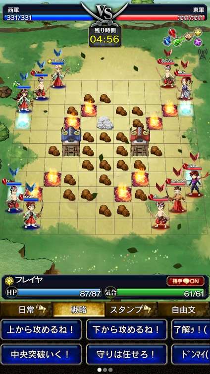 合戦時ではチャット機能が付いているので仲間とチャットしながら合戦ができます。コメントをし合えば連携プレイもできるのでチャット機能も使いましょう。合戦はプレイヤー同士が5対5で戦う真剣勝負です。相手プレイヤーを打ち倒しながら敵陣の落城を目指して勝利を掴みます。敵陣の城を攻撃すると城HPへダメージを与えることができます。この城HPを0にできれば落城の成功です。合戦では制限時間が決まっているので残り時間が0になると終了です。合戦ではキャラクターの足元にはマス目があり、このマス目を移動しながら攻撃をします。良い位置どりができたら「攻撃」や「奥義」で攻撃をします。