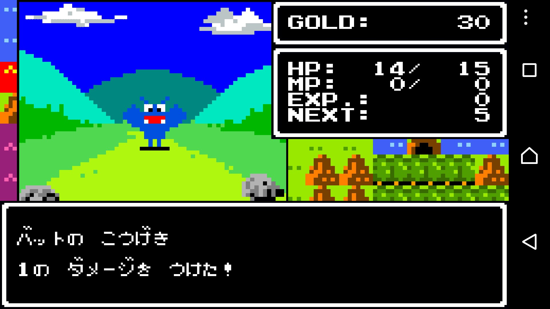 大魔王によりモンスターがばらまかれ、滅亡の危機にひんしている国を救う勇者として、プレイヤーは選ばれました。すでにこの設定だけでノスタルジアがかきたてられますが、まだまだこんなものでは終わりません。画像のとおり、すべてはドット絵で描かれています。そして、どこかで見たような「黒字に白枠、白文字」のメッセージウィンドウ…。