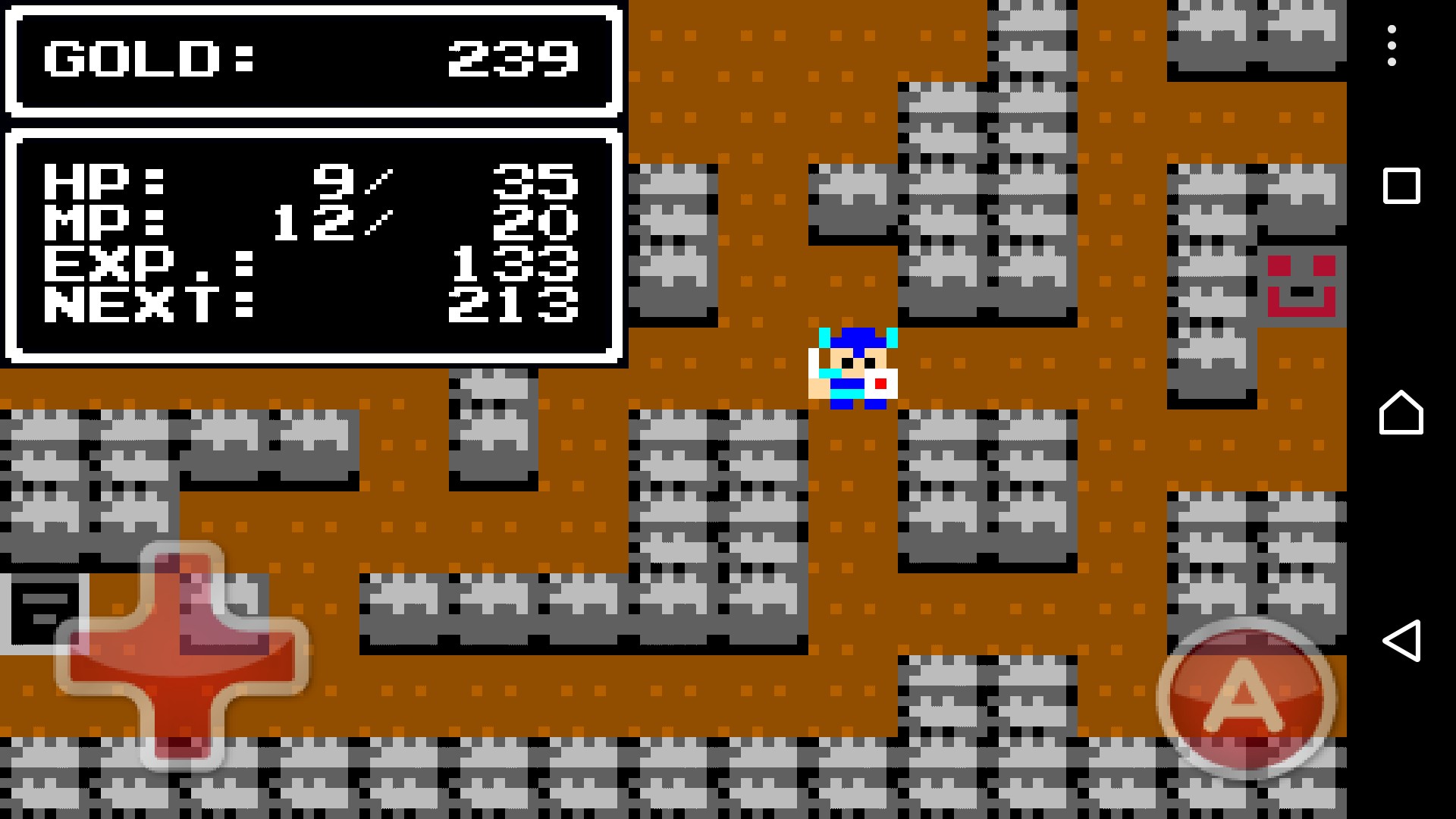 懐かしい、もうめちゃくちゃ懐かしい! ドキドキしながらうろうろしていたら、あっさりやられてしまいました。それもそのはず、良く見れば何も持っていません。まずはレベルを上げつつ、回復呪文「カイフ」、武器と防具、そして保険のための薬草を手に入れることを目指しましょう。レベル上げのために敵を求めてお城の周りをぐるぐる…危なくなれば宿屋へ…。そういえば、そんなこともありました。
