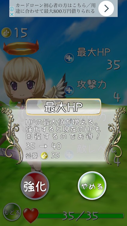 あ〜ちゃ〜が敵との戦いで勝てそうにない時には、「めにゅー」のボタンから敵のレベルを下げて様子を見ましょう。逆に、あ〜ちゃ〜が戦いで余裕が出てきたら敵レベルを上げてどんどんポイントを獲得しましょう。どうしても敵に勝てそうに無い時は、一旦トップ画面に戻って、再度あ〜ちゃ〜との旅に出かけましょう。