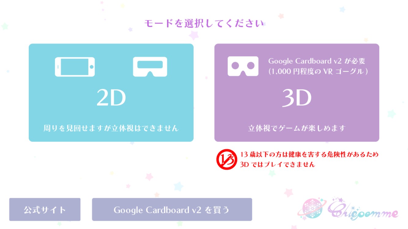 「chiepomme vr」ではアプリを移動するとはじめに、「2D」と「3D」のタイプを選択することができます。「2D」タイプは、周りを見回せますが立体視することができません。「3D」では立体視でゲームを楽しむことができます。ただ、「3D」タイプはGoogleCardboardv2(1,000円程度のVRゴーグル)が必要になります。また、13歳以下の方は健康を害する危険性があるため「3D」ではプレイできないと表示されています。お金をかけたくない方は「2D」タイプがおすすめです。「2D」タイプでも十分に楽しむことができます。