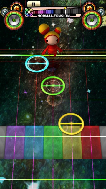 キャラクターを選択後、ゲームスタートです。手前にカラフルな鍵盤が並んでいます。上の方には、キャラクターが立っていて鍵盤をタップするとタップした鍵盤のラインまで歩いてきます。手前から流れてくるリングは鍵盤と同じようにカラフルなので、色に合わせてタップしていきます。タップするタイミングで「Good」「Great」「Just」「Bad」「Miss」と表示されます。上手くいけば上の中央に表示されているテンションゲージが上がり、ミスばかりだと減ってしまいます。このゲージが0になるとゲームオーバーです。