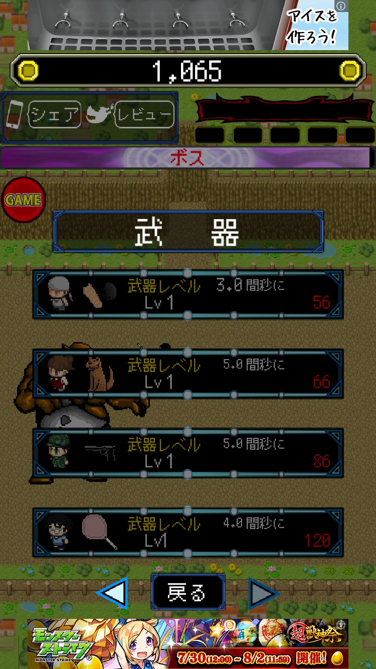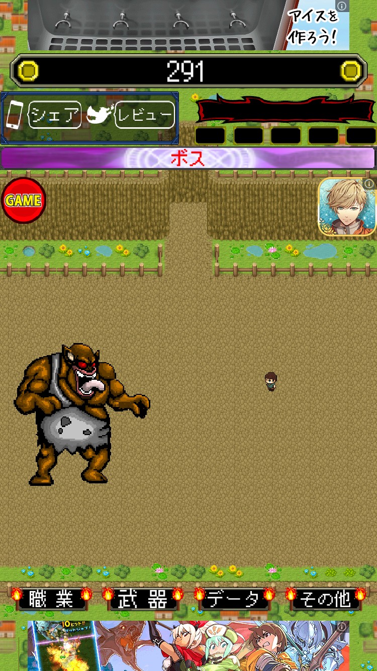 またメニューも「職業」、「武器」などシンプルでわかりやすいのです。攻撃して、コインを稼いで、村人と武器を増やす。これほど単純なゲームなのに、なぜかクセになっちゃうんですよね!