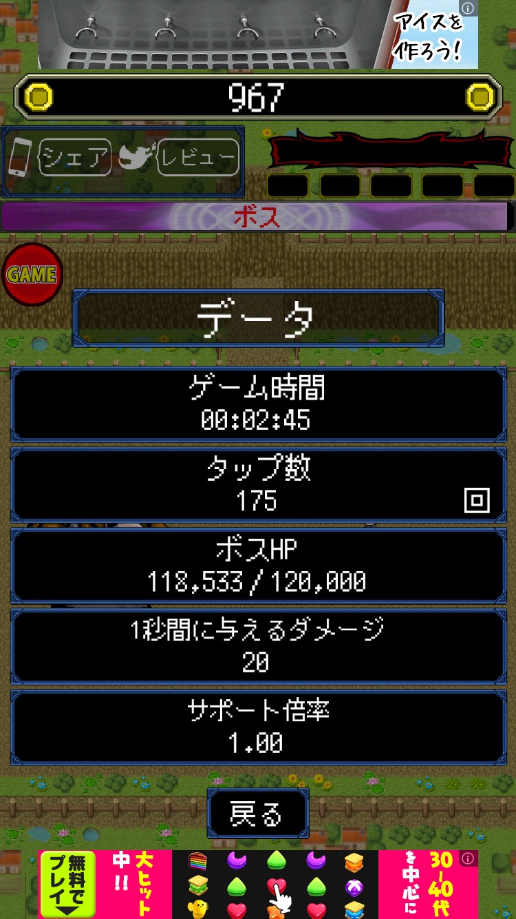 とにかく「楽」に楽しめるゲームだと思います。村人や武器を増やすために必要なコインはなかなか貯まりませんが、根気よく放置し続けていれば攻略可能!