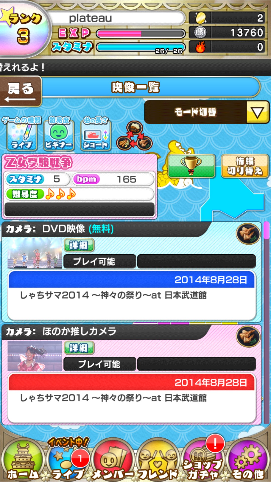 ゲームを始める際に無料動画か有料動画、いずれの動画で遊ぶかを選択します。有料動画は、ゲームプレイの際に消費するスタミナを使うことなく、自由に閲覧することが可能です。楽曲によっては、有料動画しかないものも。更に、ライブ映像を購入すると、推しているメンバーが成長します。
