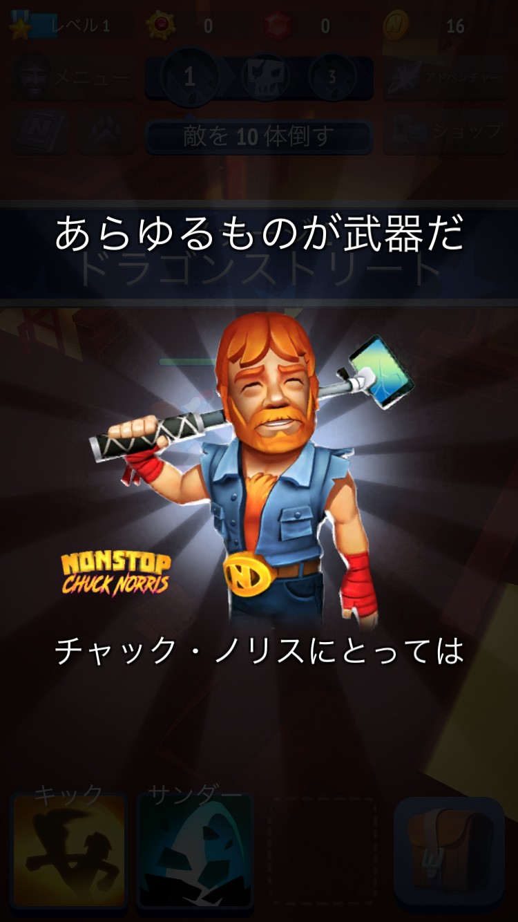 普通のアクションゲームと違うところはアプリ名の通り「ノンストップ」ということ。例えあなたがスマホを放置しようとも、チャックノリスはノンストップで走り続け、戦い続けるのです!
