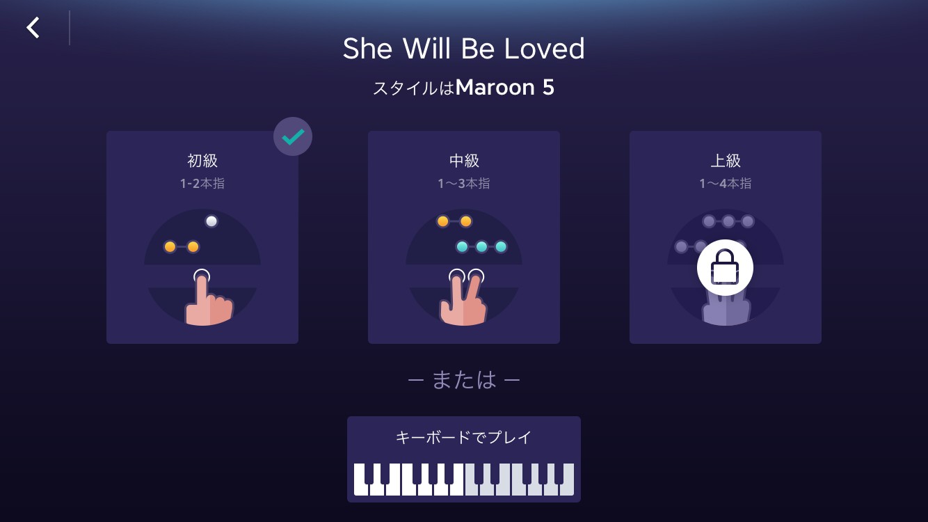 早速、無料の曲を挑戦してみました。再生ボタンをクリックすると、初級、中級、上級を選択する画面が表示されました。初級は1〜2本指、中級は1〜3本指、上級は1〜4本指を使用しながらゲームをします。最初は、初級しか選択できません。慣れるために初級から挑戦してみましょう。このまま初級〜上級のいずれかを選択すると、ゲームがスタートします。