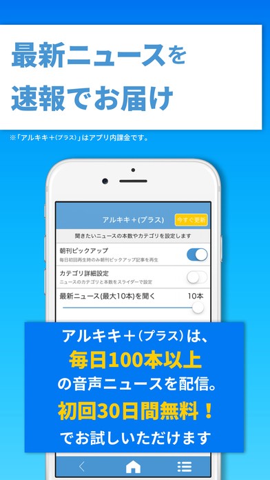 「朝日新聞アルキキ」をお使いになってみて、もっとニュースを聞きたいと思ったら、アプリ内課金で「アルキキ+(プラス)」の契約をされることをおすすめします。「アルキキ+(プラス)」は月額240円で利用が可能で、30日間の無料お試しをご利用いただくこともできますので、とりあえず使ってみて検討されても良いでしょう。無料トライアルが終了する1か月後に自動更新されますので、更新されない場合は、iPhoneの設定から解除が必要なことはお気を付けください。