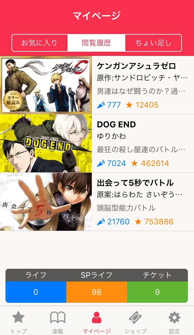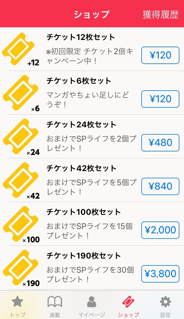 基本的に、マンガを読むには、1話あたり、ライフかチケットの何れかを1話分消費します。