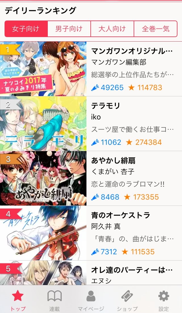 アプリ表示では、女子向け・男子向け・大人向け・全巻一気ランキングと区分されており、