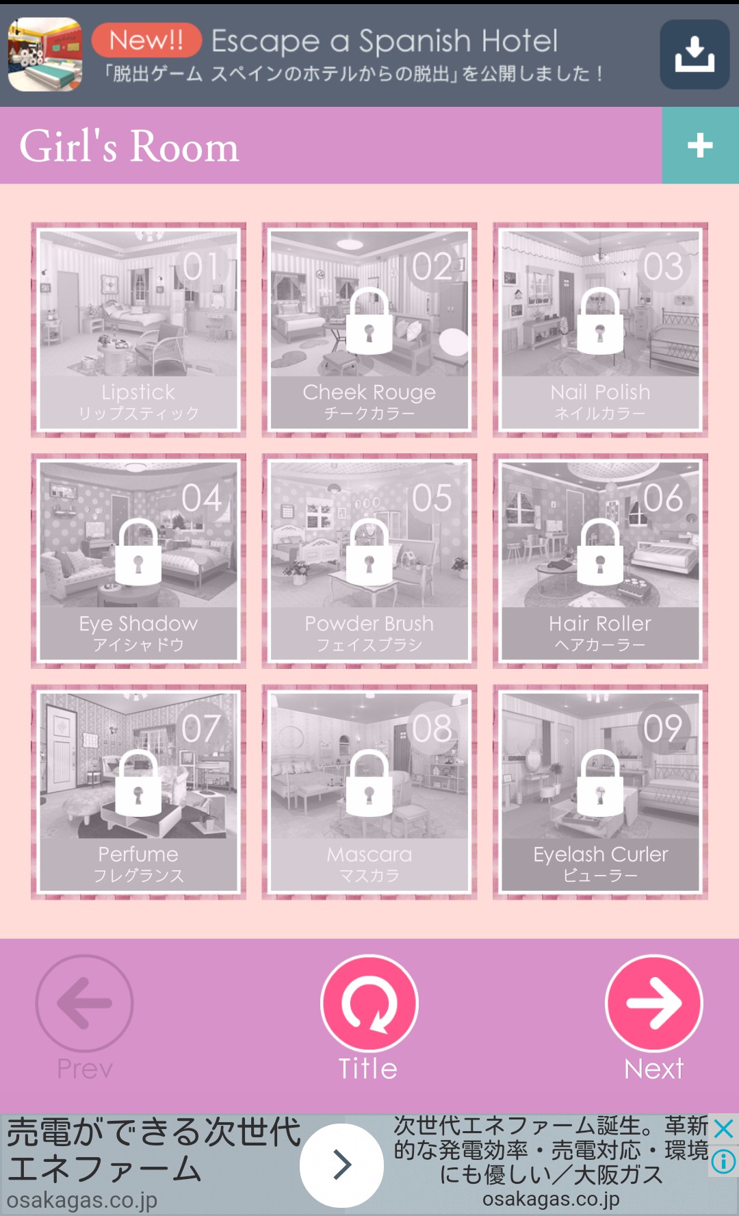 かわいいを意識した女性向けゲームをリリースしているFUNKY LANDが贈る脱出ゲーム「脱出ゲーム ガールズルーム」。今回のミッションは5つのコスメアイテムを探し出して部屋から脱出するというもの。全18ステージが用意されています。女性向けということで、難易度は比較的易しくなっていていますが、もちろん頭を悩ませる問題も含まれているので侮ることなかれ。記憶力や機転も必要です。何よりグラフィックがきれいでかわいい部屋のあちこちを探索するのも楽しい脱出ゲームです。