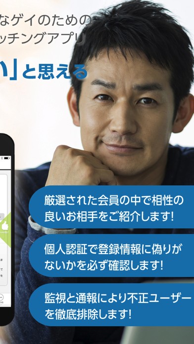 におすすめしたいアプリです。なかなか周りにカミングアウトできず、出会いを見つけられない人から多く利用されています。審査項目が多いうえ審査基準が厳しく、スタートするまでは少し時間がかかりますが、その分安全性は期待できるので、マッチングアプリが初めてだという人にもおすすめのアプリです。
