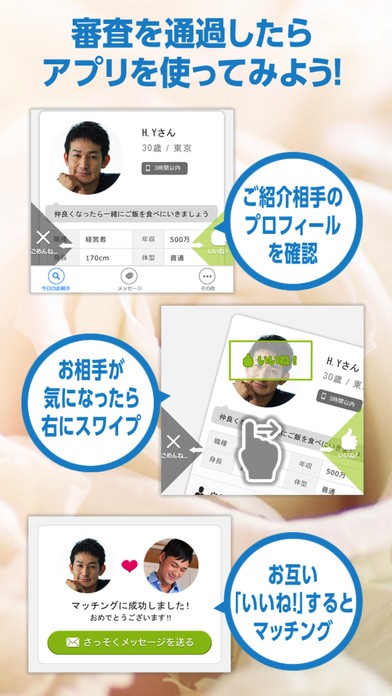 画面を右にスワイプすると、相手に「いいね!」が送れます。相手からも「いいね!」が返ってきたらマッチング成立です。