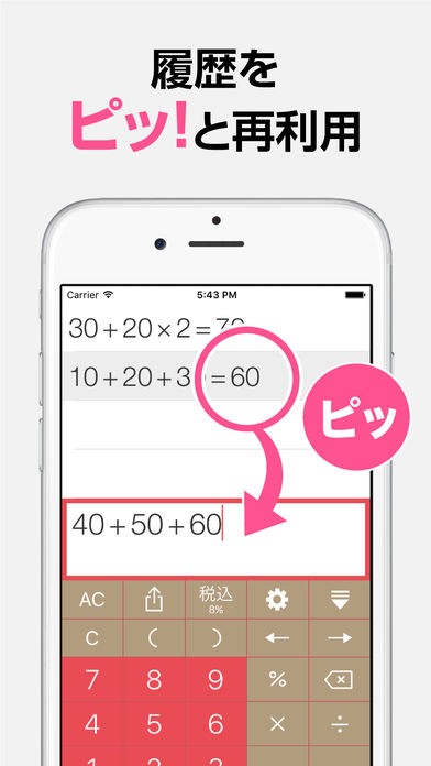 また、上に表示されている計算式と答えをタップするだけで、どんどん足し算をしてくれます。この機能があると合計金額の計算もすぐにできちゃいます。
