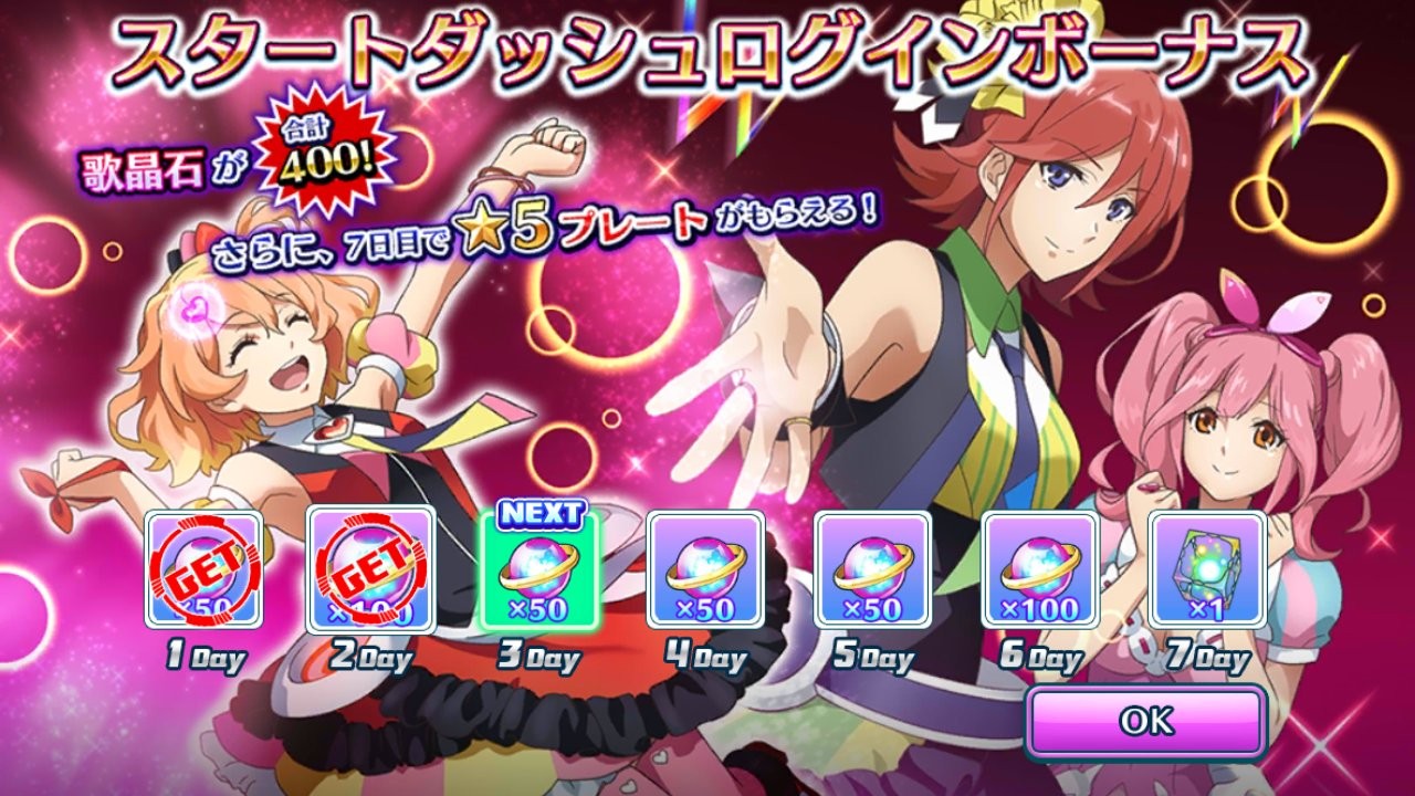 通常のログインボーナスとは別に用意されたもので7日間ログインすることで報酬をもらえ、トータルで歌晶石400個と星5プレートが手に入ります。