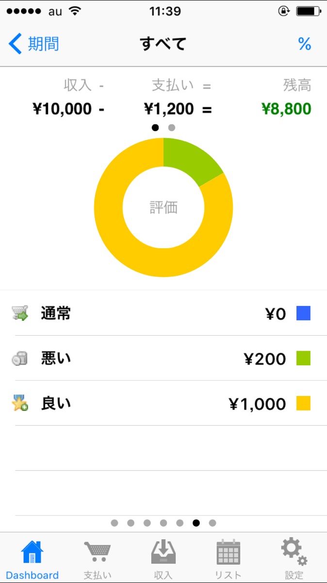 支払いを入力する際に「通常・悪い・良い」の3段階の評価を入力すると、円グラフ評価の割合を表示してくれます。円グラフは他にもいろいろなパターンがあるので、自分なりの評価で特定の支出に対しての評価ができます。