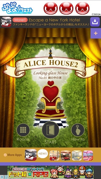 「脱出ゲーム アリスハウス2」には全部で9つのお部屋が用意されています。No.01 鏡の中の家、No.02 生きた花の庭、No.03 コンパートメント、No.04 うす暗い森、No.05 羊の雑貨屋さん、No.06 せまくて高い壁、No.07 白の騎士、No.08 アリス女王、No.09 アリスの晩餐会の9つです。キレイなグラフィックのアリスの世界がを楽しみながらプレイする事もできます。謎解きして一つ一つの可愛いお部屋から脱出していきましょう。ライトに脱出ゲームを楽しみたい人に丁度いいボリュームですよ。