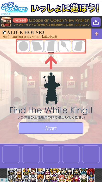 アプリ操作のやり方ですが、まずアプリを起動すると画面中央に「Start」のボタンがあるのでここをタップします。そうするとアリスの可愛いお部屋の画面になり、そこにはお題となる「5つの白の王様を見つけて脱出してください」など表示されるのでお題に沿った内容でゲームを進めていきましょう。ゲーム内での操作は画面をタップするだけなので誰でも簡単に操作することができます。部屋にあるアイテムは選択して使うので、その場面に来たら使うアイテムを選択しましょう。アリスの部屋では5つのキーアイテムが必要なので、頑張って5つのキーアイテムを探しましょう。