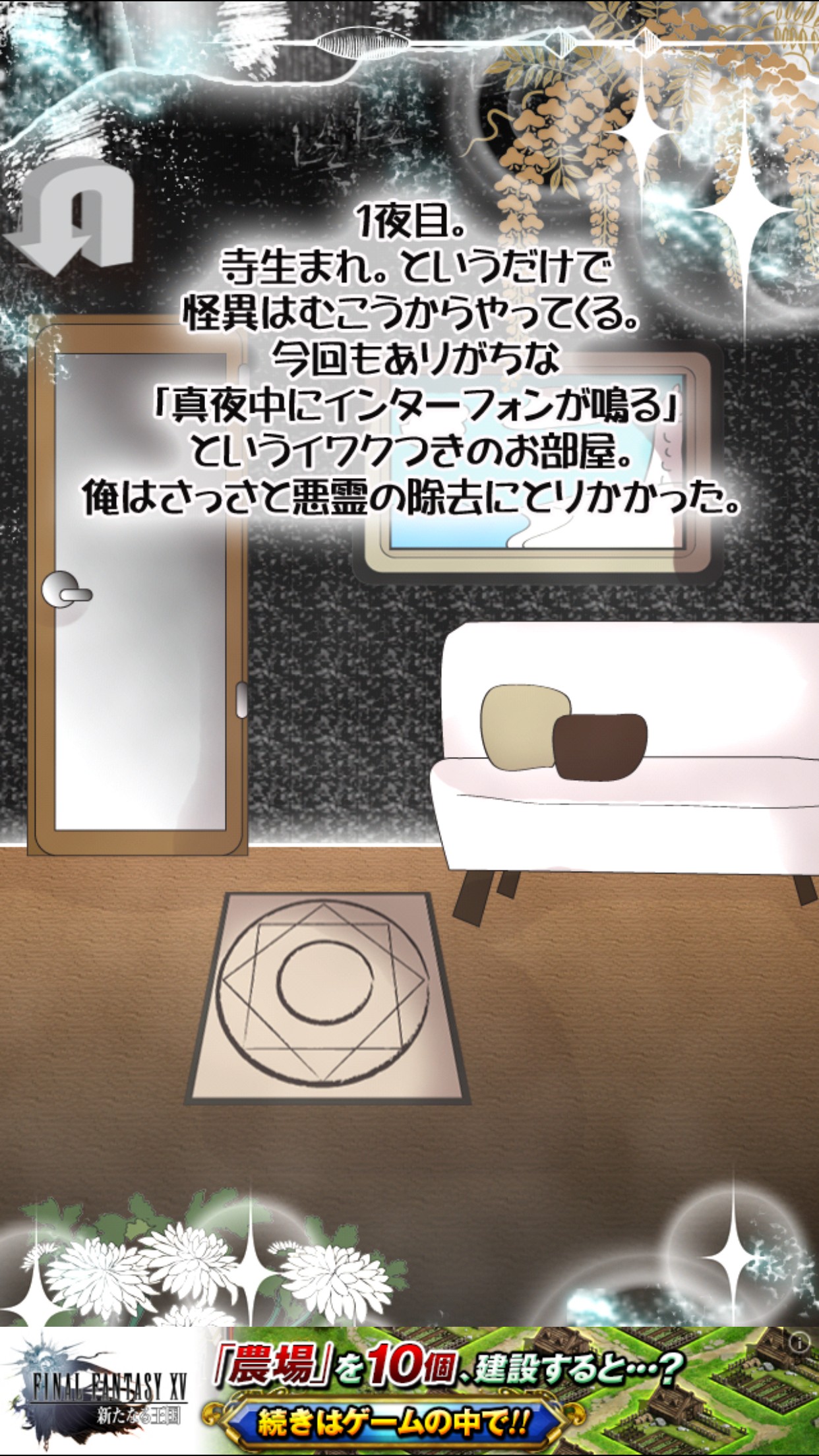 このゲームアプリでは、「真夜中にインターホンが鳴る」というイワクつきのお部屋にあるさまざまなヒントを元に謎を解き、謎を解くと結界を結ぶことができます。