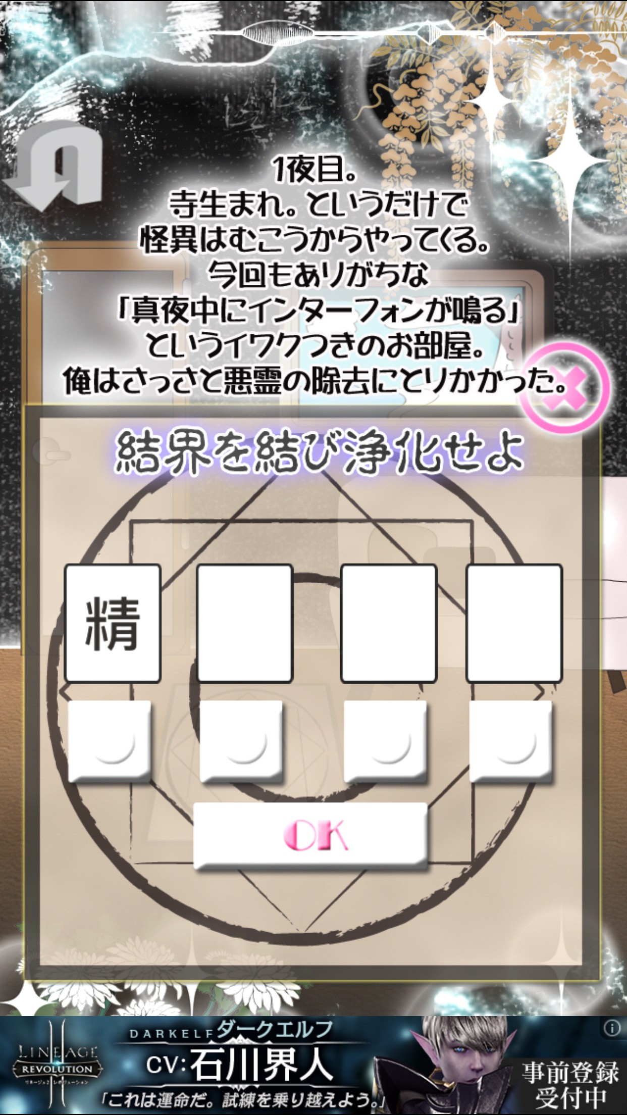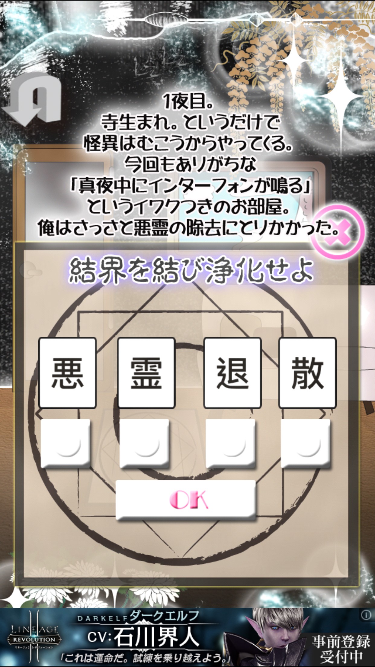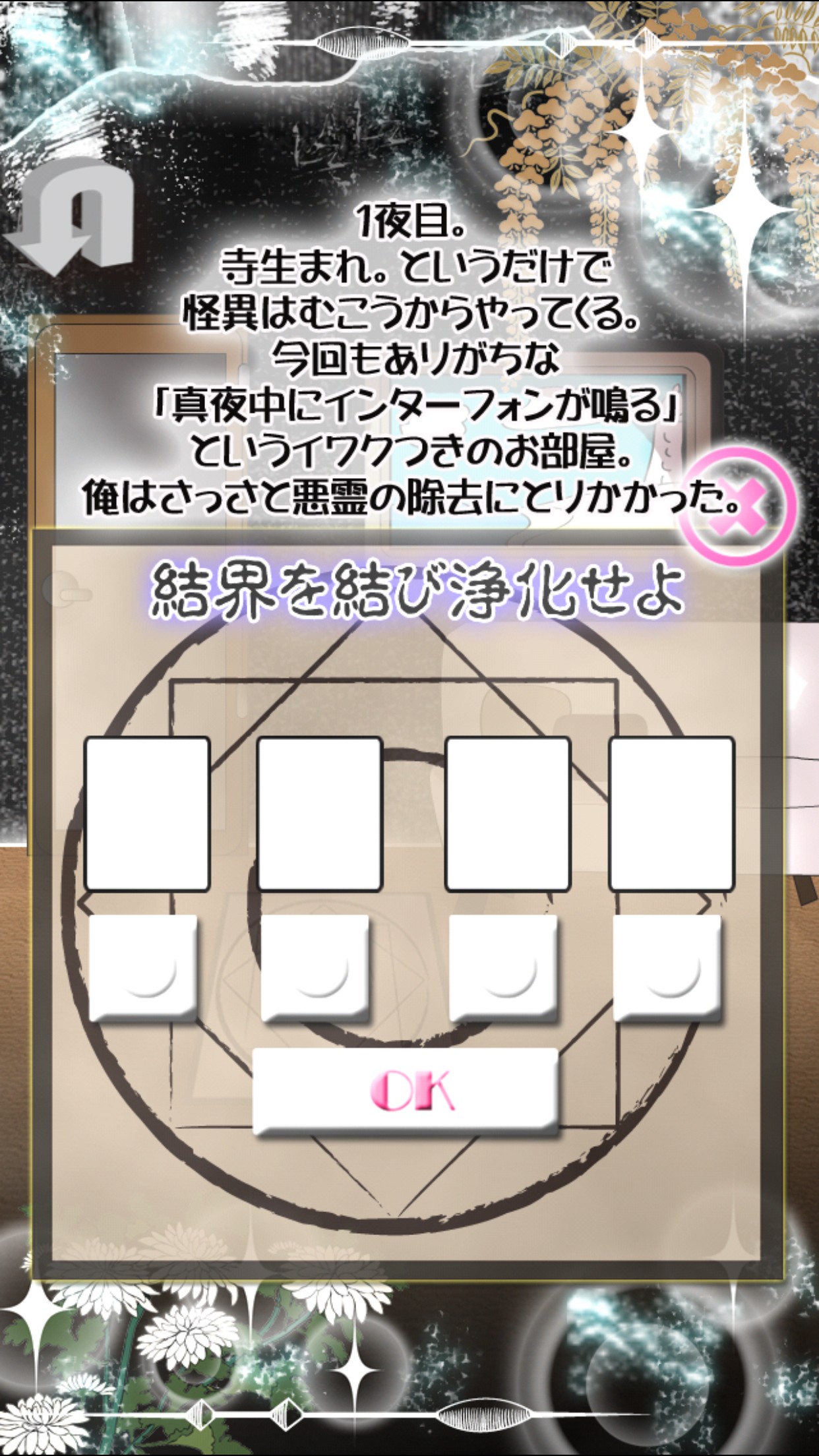 何度もタップしていると、「悪霊退散」という言葉ができるということに気が付きました。確かに「悪霊退散」は結界を結ぶときの定番の言葉ですね!表示を「悪霊退散」にしたまま、「OK」をタップします。