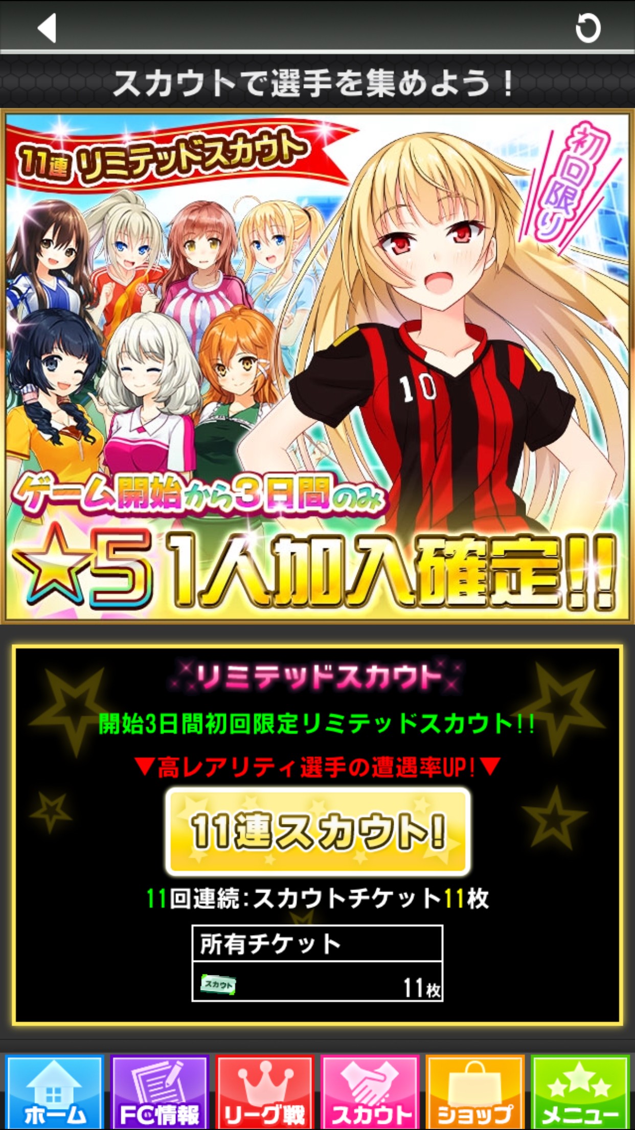 何度も根気よく「スカウト」をして信頼度を上げると、スカウトした女の子がチームに加入してくれます!