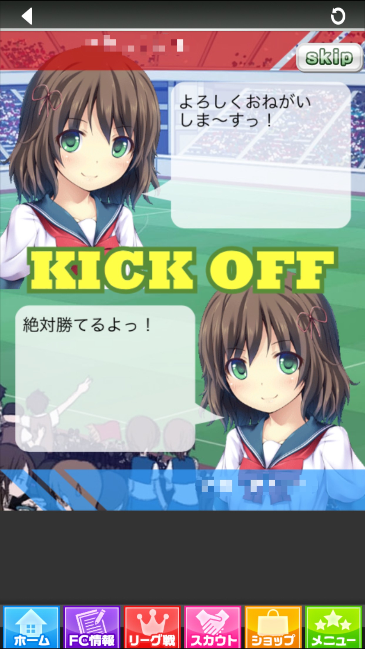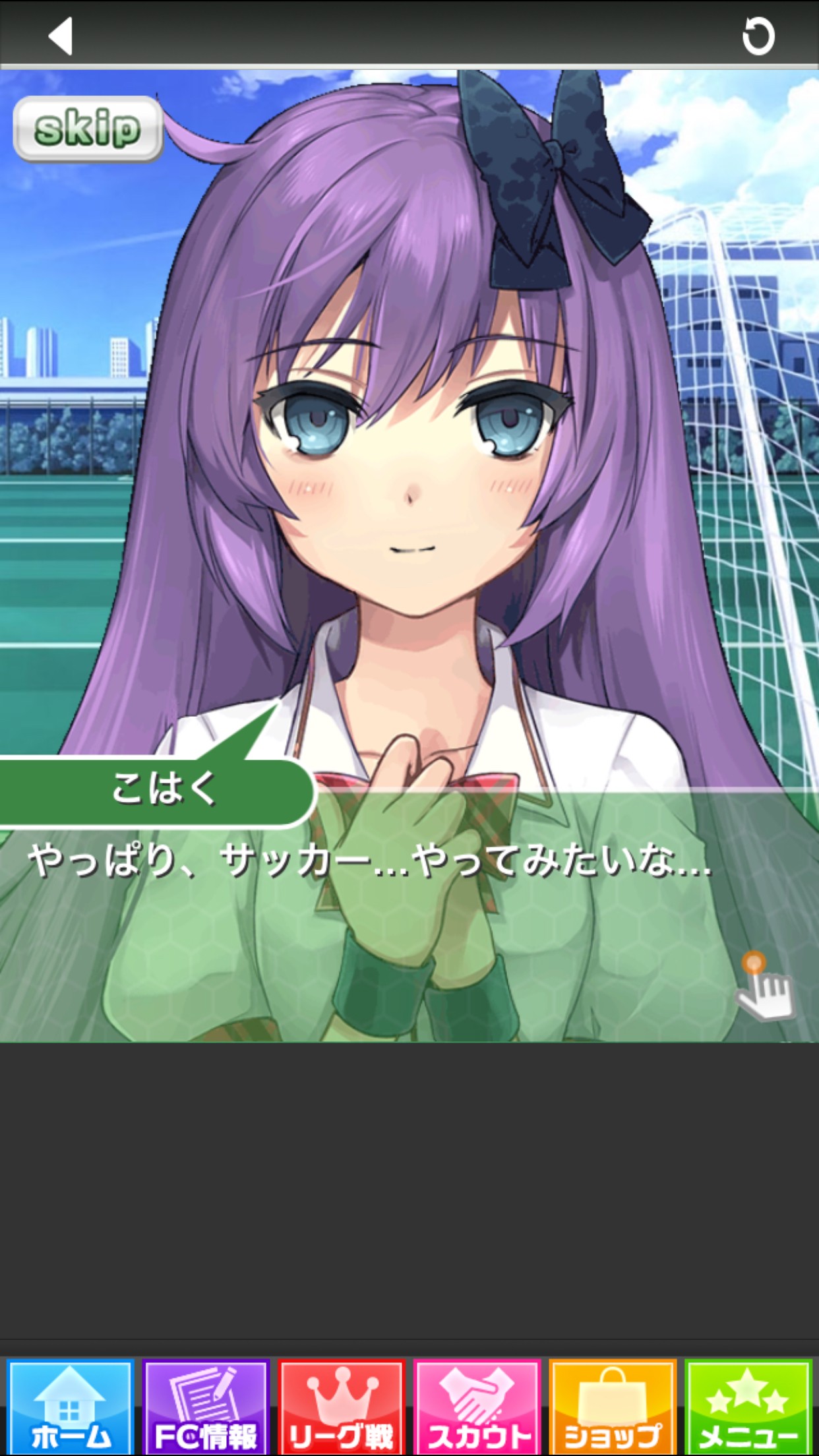「スカウト」をすると、チームに加入してくれるかもしれない女の子と出会うことができ、女の子とのイベントが発生します。