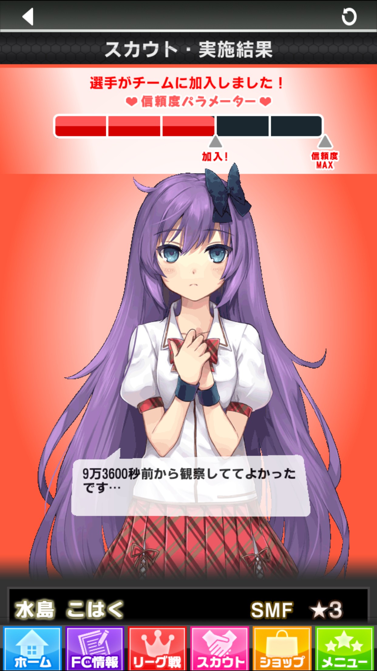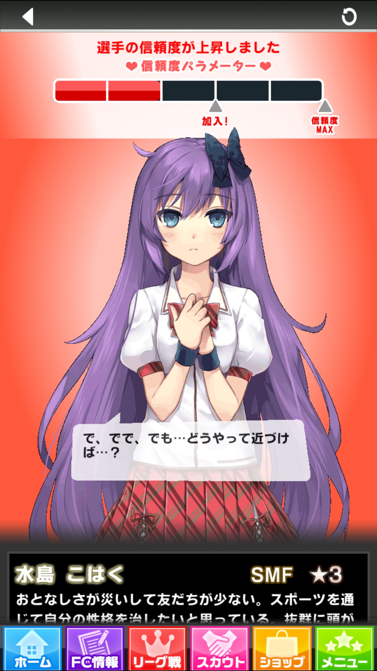 「スカウト」ではあくまでチームに加入してくれるかもしれない女の子と出会うだけ。「スカウト」したからといって、女の子がチームに加入してくれるとは限りません。何度も根気よく「スカウト」をして、女の子との信頼度を上げていきましょう!