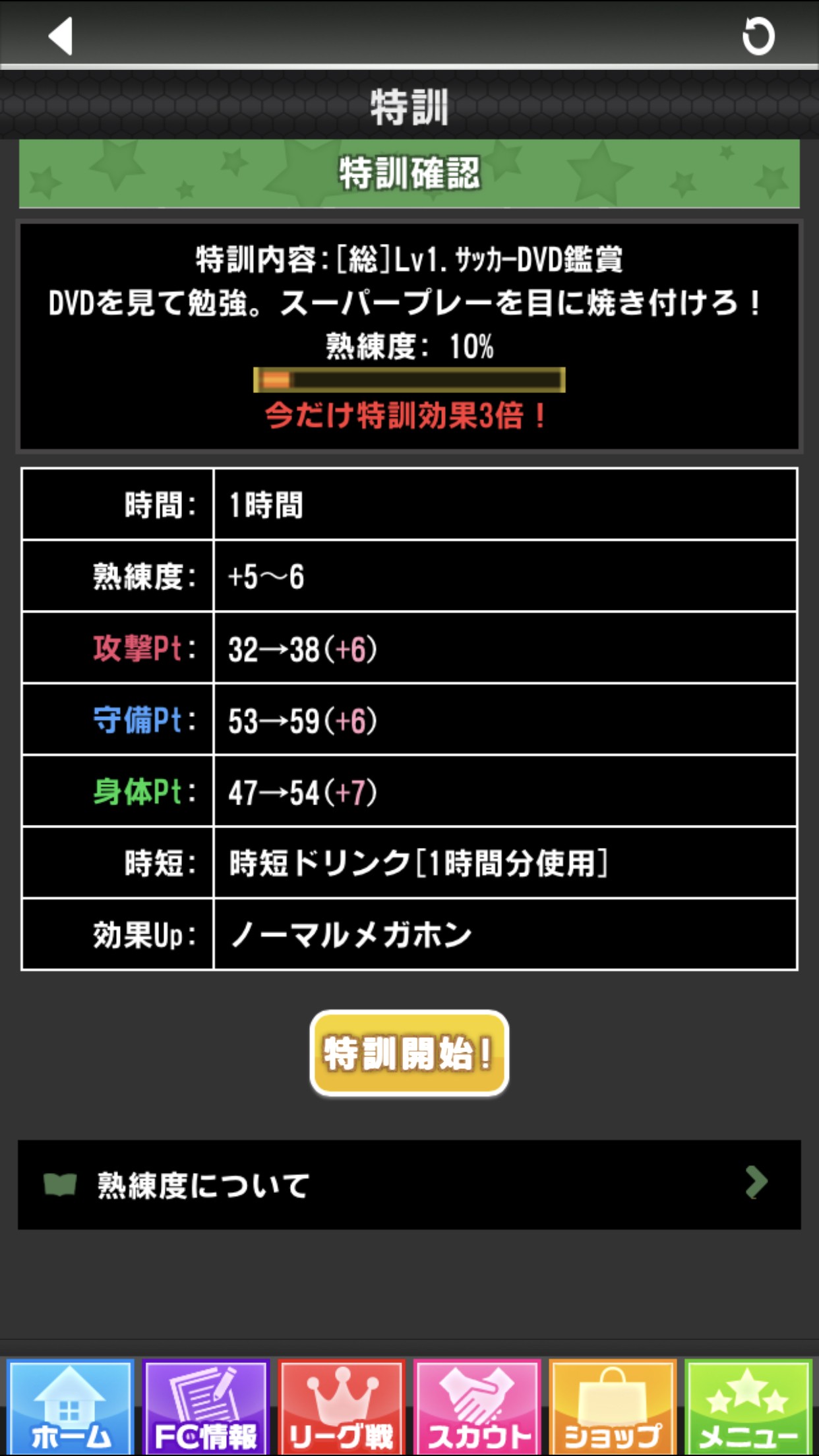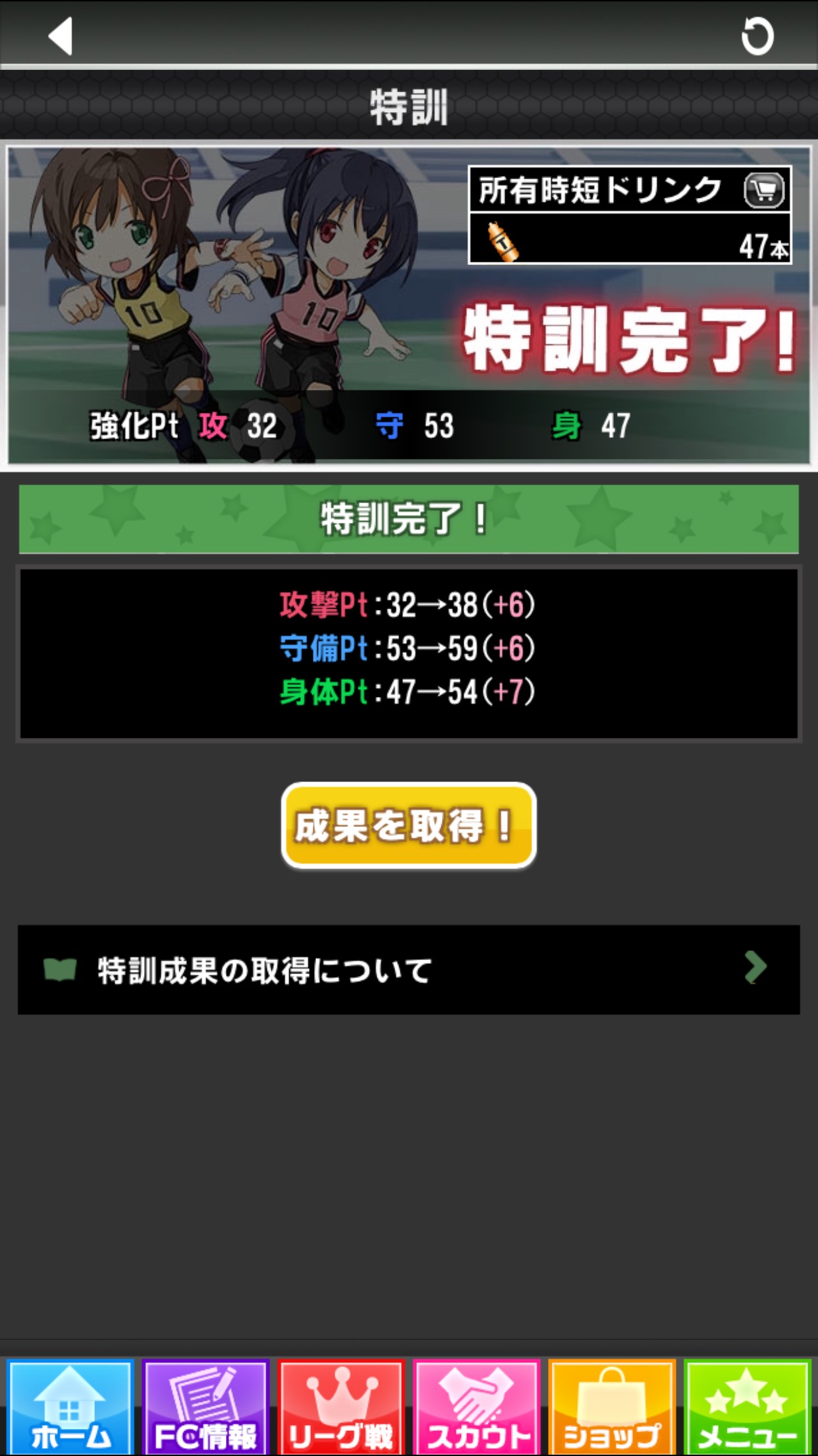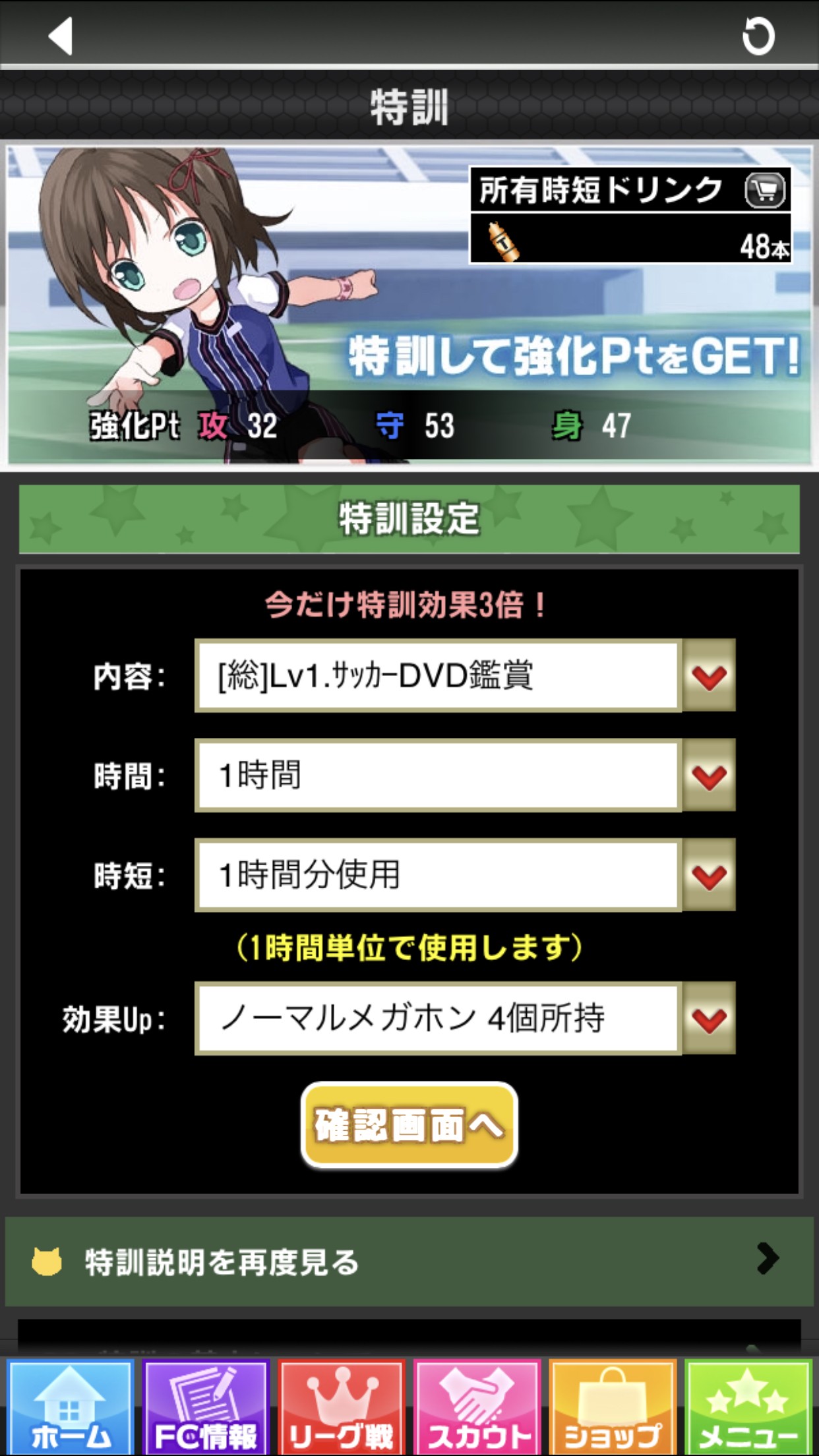「スカウト」でチームに加入する女の子を勧誘したら、次は勧誘をした女の子を育成して、選手として育てていきます。育成するには、「強化pt」が必要になります。「特訓」をして「強化pt」を獲得していきます。特訓をするには、「FC情報」→「特訓」をタップして、特訓メニューを選び確認画面」をタップします。