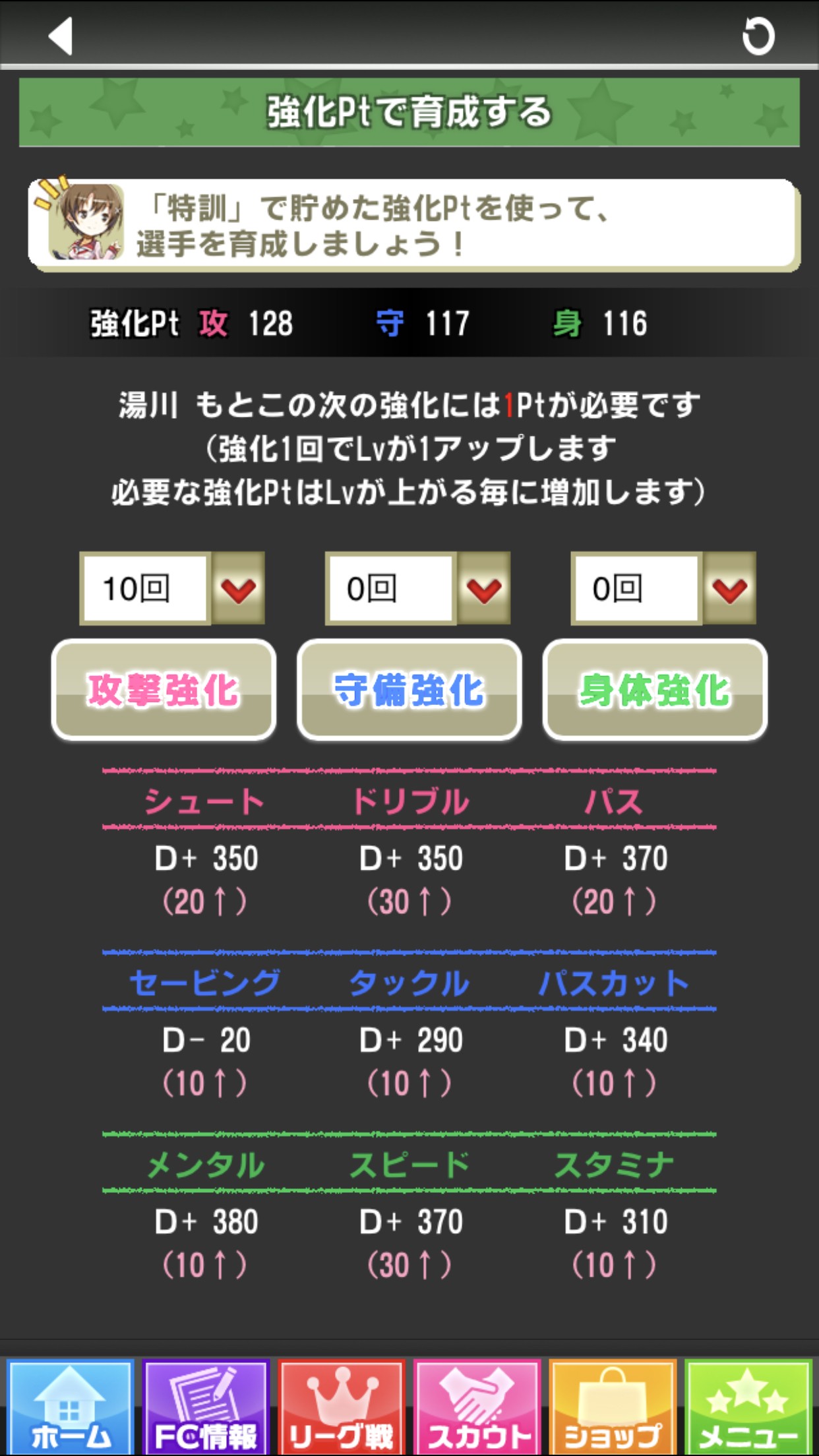 「特訓」で「強化pt」を獲得したら、次は「強化pt」を使って選手たちを育成していきます。「FC情報」→「育成」をタップすると育成画面が表示されますので、「攻撃」「守備」「身体」の中から強化したいところを選び、回数を決めて強化していきます。回数を選ぶと、上がるパラメーターが表示されますので、確認しながら育成をしていきましょう!
