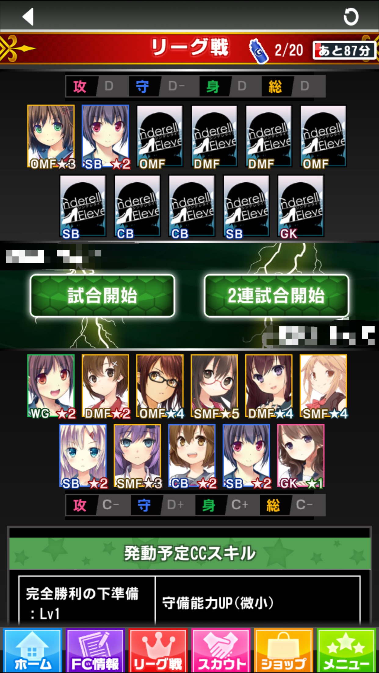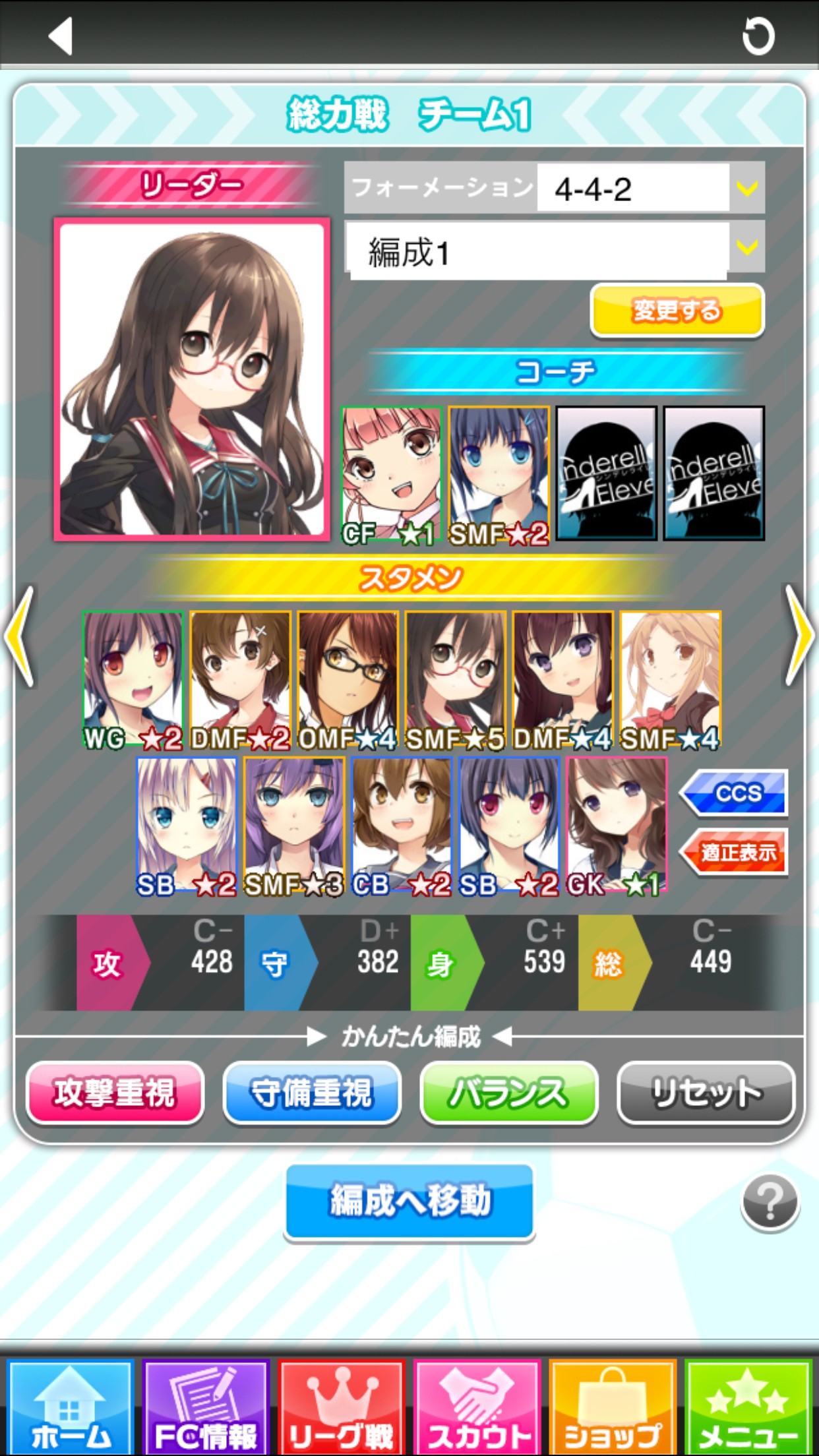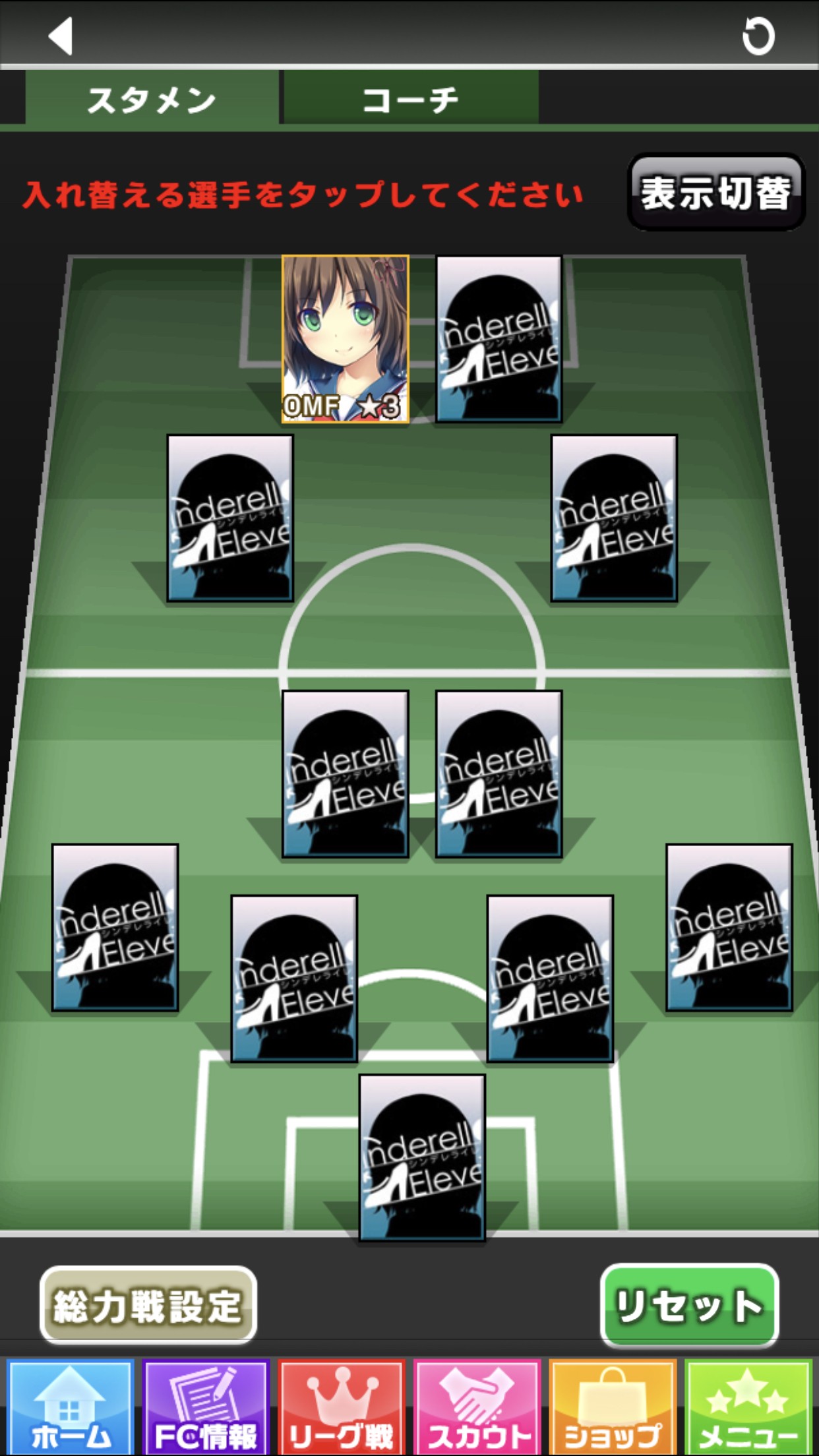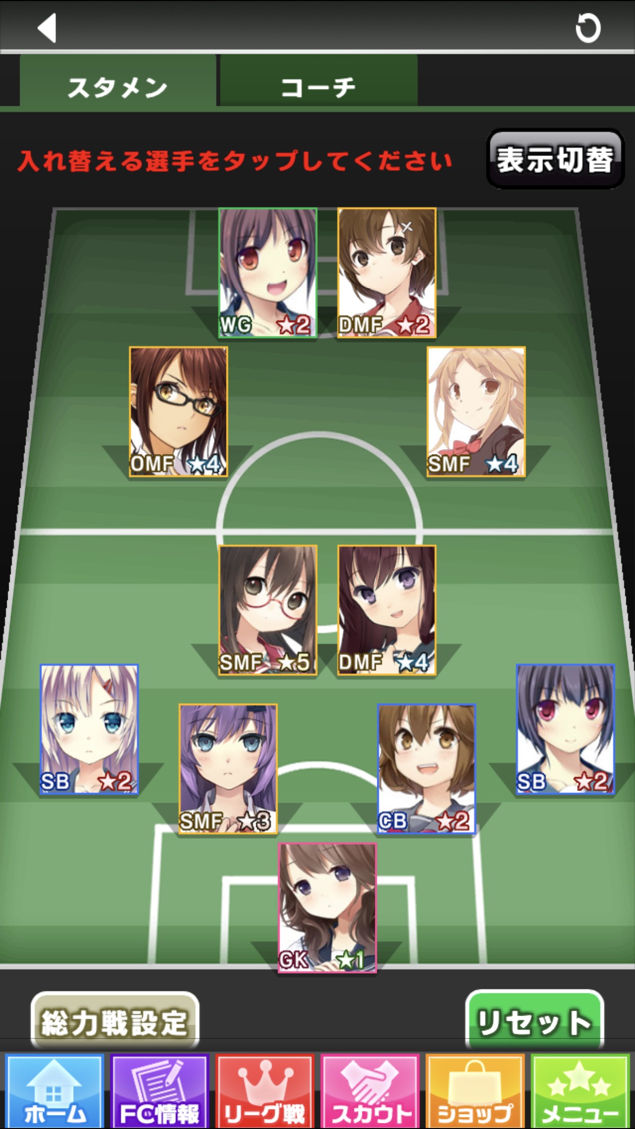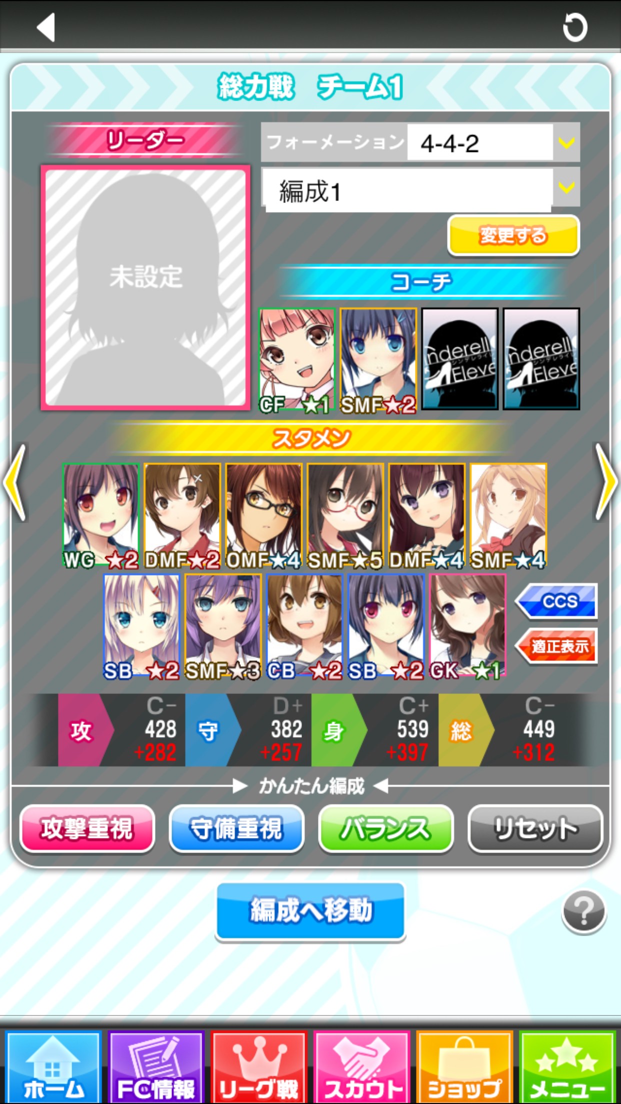 「FC情報」→「編成」をタップすると、このような画面が表示されます。「総力戦設定」をタップすると、チーム編成の画面が表示されます。