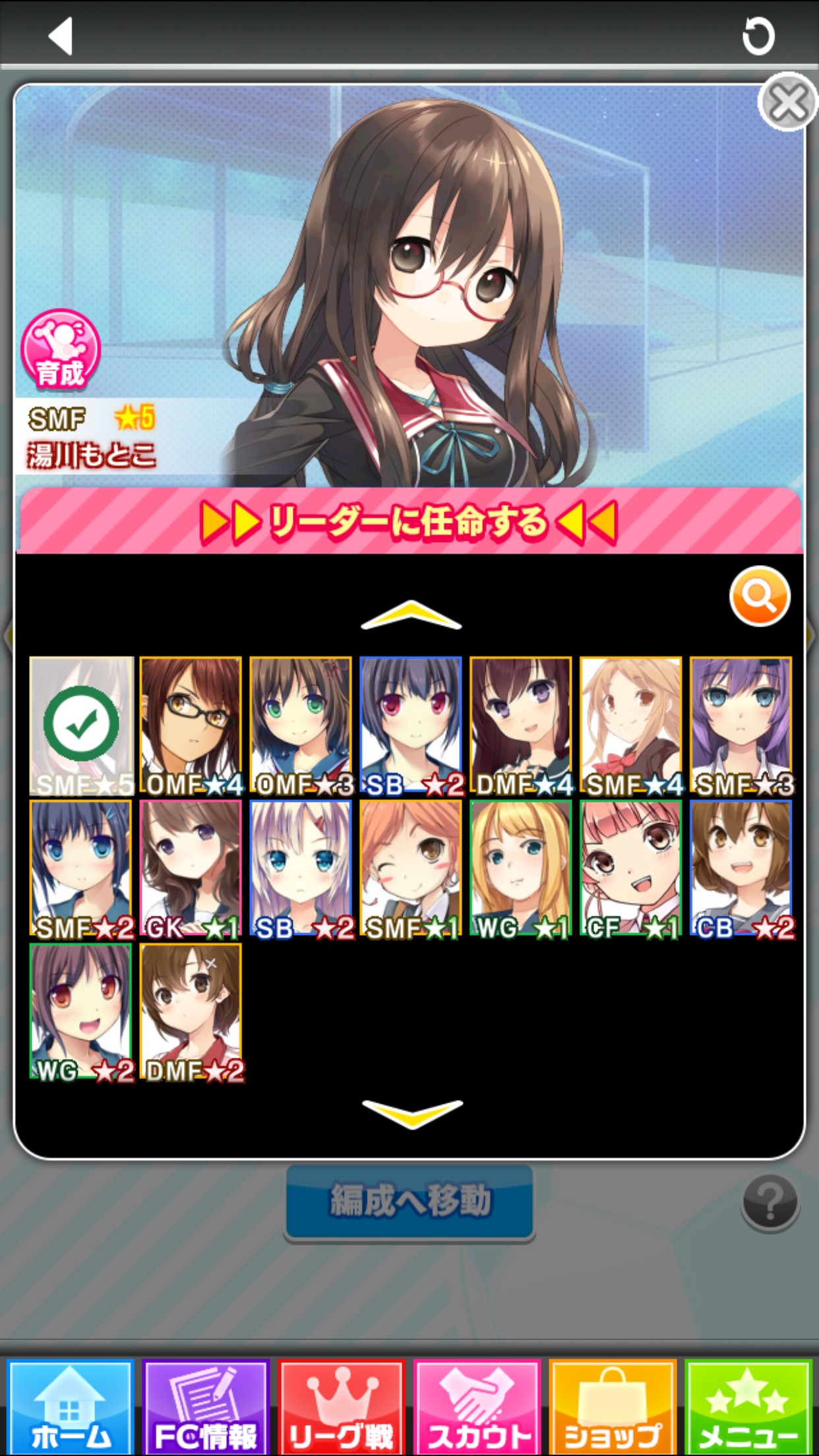 チーム編成とリーダーを決めると、このような画面になります。「編成へ移動」をタップして、どのようなチーム編成になっているのか確認しましょう!