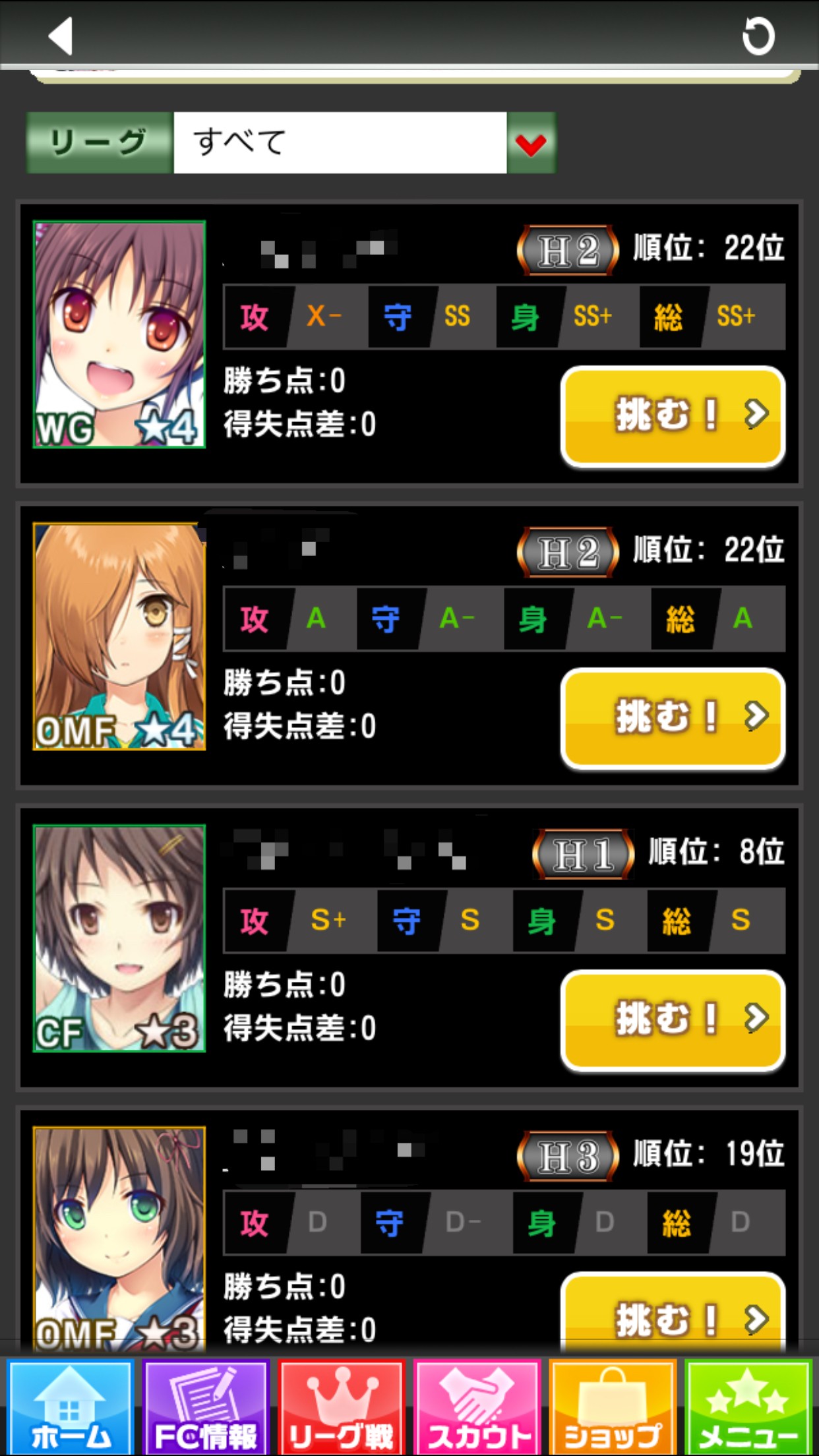 チーム編成をしたら、いよいよ全国のクラブと試合をしていきます。「リーグ戦」をタップして試合の画面を表示すると、このような試合相手のクラブの一覧が表示されます。試合をするクラブを選んで「挑む!」をタップします。