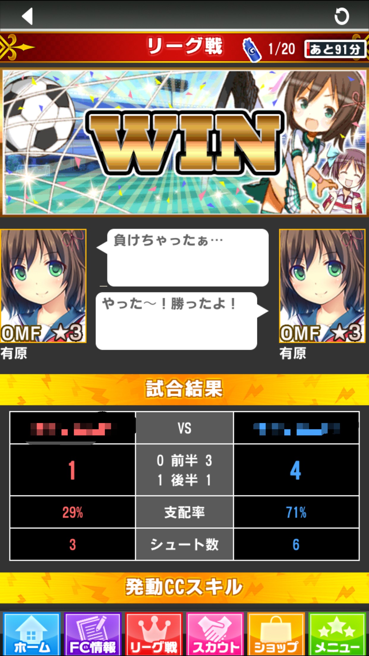 試合が終わると、このように。試合の結果が表示されます。全国のクラブに試合を挑んでいき、全国大会の優勝を目指していきましょう!