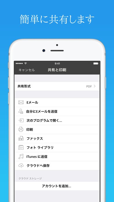「JotNot Pro」は、紙書類をスマートフォンやタブレットに取り込むだけではありません。様々な方法でPDF化またはJPEG化したファイルを共有できるので便利です。「Evernote、iCloud、Eメール、Dropboxなど」で共有できるので、自分が使っているツールを利用すれば、パソコンや他の人に簡単に取り込んだ書類を送信できてしまいます。また、アメリカのみですが、ファックス番号に送信することも可能です。日本でも、ファックス送信できるようになれば、より便利になりますね。機密ファイルにはパスワードをつけることもできるので、安心です。カメラ撮影でも、影やゆがみの補正もしてくれるので、簡単にスキャンできます。メモやレシート、名刺などはもちろん、楽譜やスケッチ、写真もスキャンして、PDFまたはJPEGで保存できます。