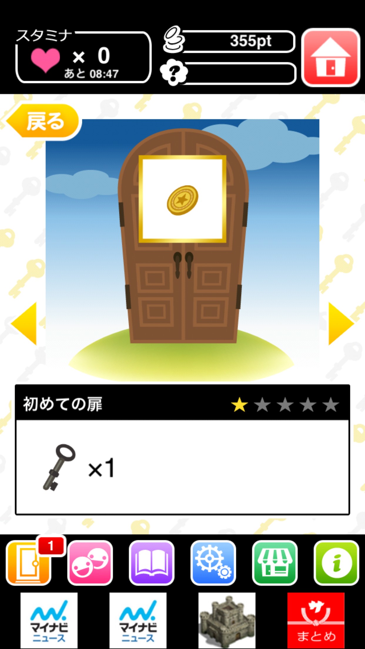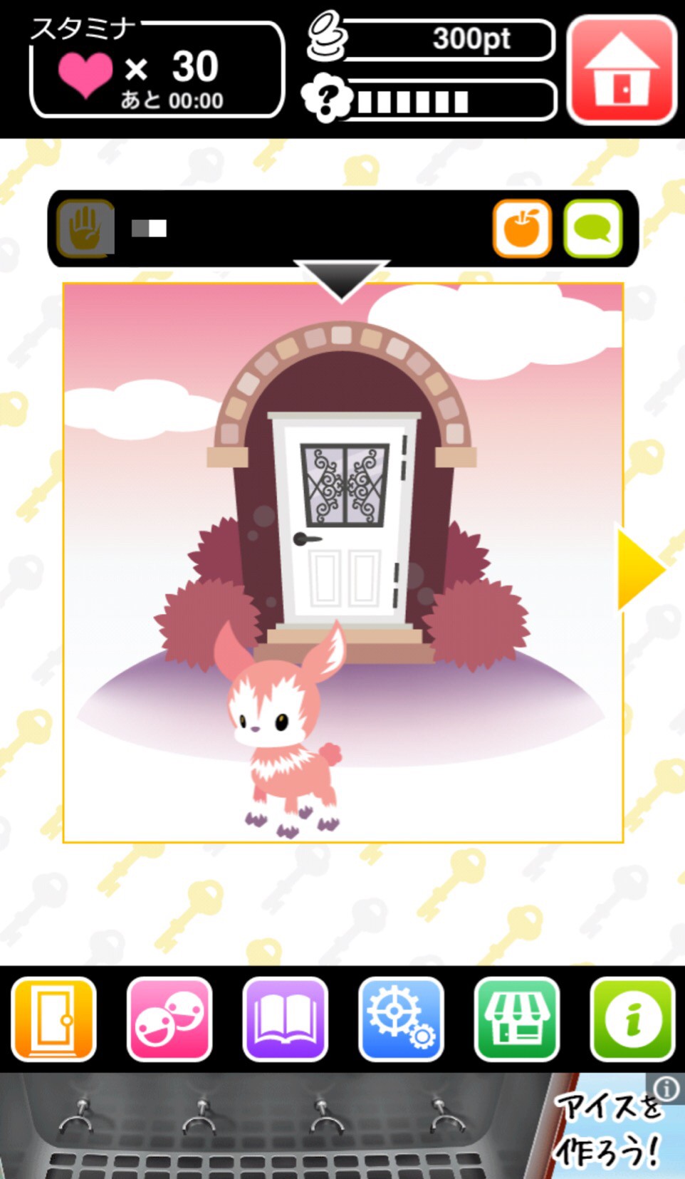 ピケからもらった鍵を集めると、ドアを開けることができます。ドアの前に表示されているアイテムが、ドアを開けたときに獲得できるアイテムです。ドアを開けるには、指定された鍵が必要な数だけ必要です。この「初めての扉」には「普通の鍵が1コ」必要です。普通の鍵を1コ所持していますので、「初めての扉」を開けてみましょう!