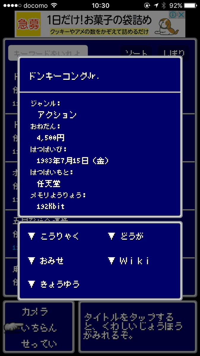 「ファミキャプ」は、ファミコン専用のゲームカートリッジラベルを、携帯のカメラで画像認識するだけで、そのゲームのタイトルや詳細なデータ、攻略情報、発売情報、関連動画を表示することができます。簡単に情報を調べられるのがこのアプリの最大の魅力です。ゲームを実際にしたことがある人は経験あると思いますが、ゲームの最中に攻略本で攻略方法を調べたり、ネットで検索したりするのは、結構面倒ですよね。でもこのアプリをあらかじめダウンロードしておけば、ささっと知りたい情報を調べることができ、ゲームを長時間中断することなくスマートにプレイを楽しむことができます。また、あらかじめ最初から登録されているゲーム情報を確認することも可能です。「お店」アイコンを選ぶとそのソフトを通信販売しているサイトに飛ぶことができるので、プレイ中のゲーム情報や攻略法を調べるほかにも、「新しく購入を検討しているゲームがどんなものなのかを調べたい。」、「どんなゲームがおもしろそうだろう。」といったときにもこのアプリが役立ちそうですね。