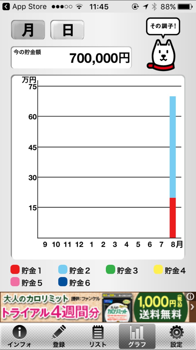 グラフ管理からは、登録した貯金総額の月ごとの推移をグラフで確認できるので、家計簿として毎月のお金の動きをつかむことができます。