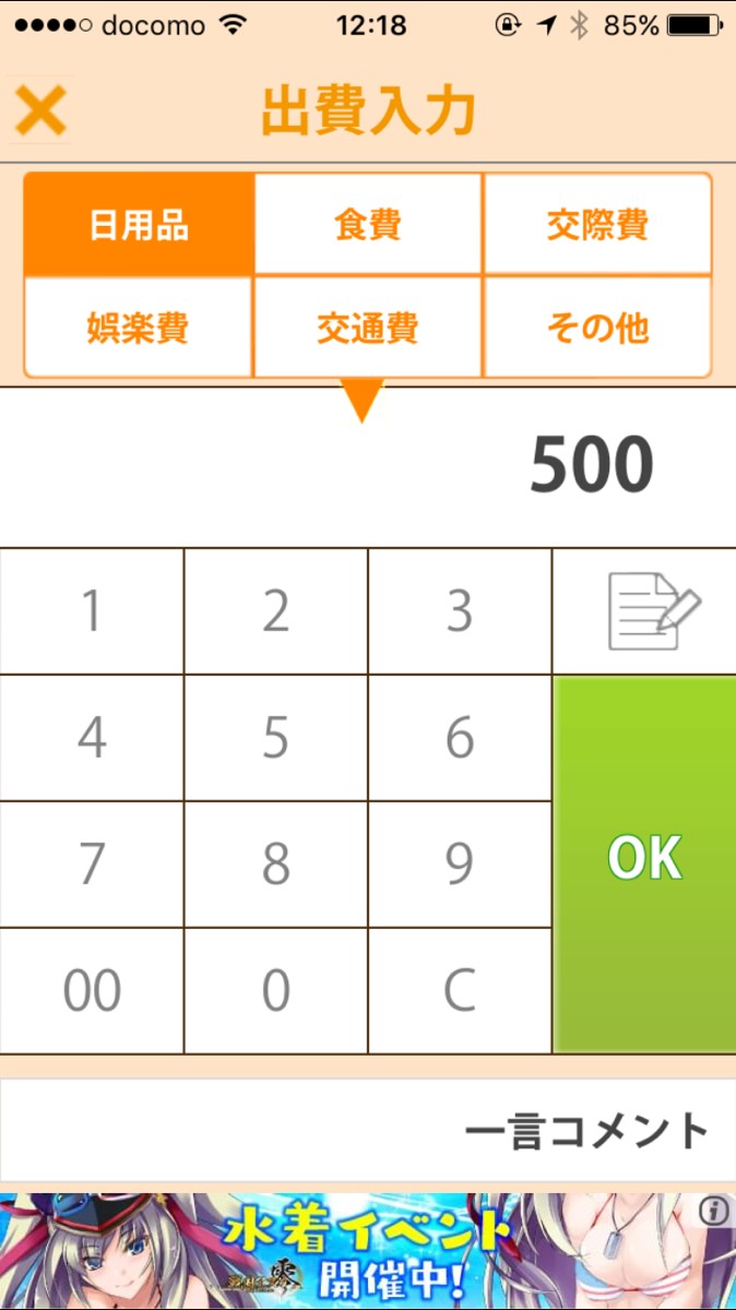 記録画面にはカテゴリを選ぶところがあるので当てはまるものを選び、金額を入力して「OK」ボタンを押せば完了です。